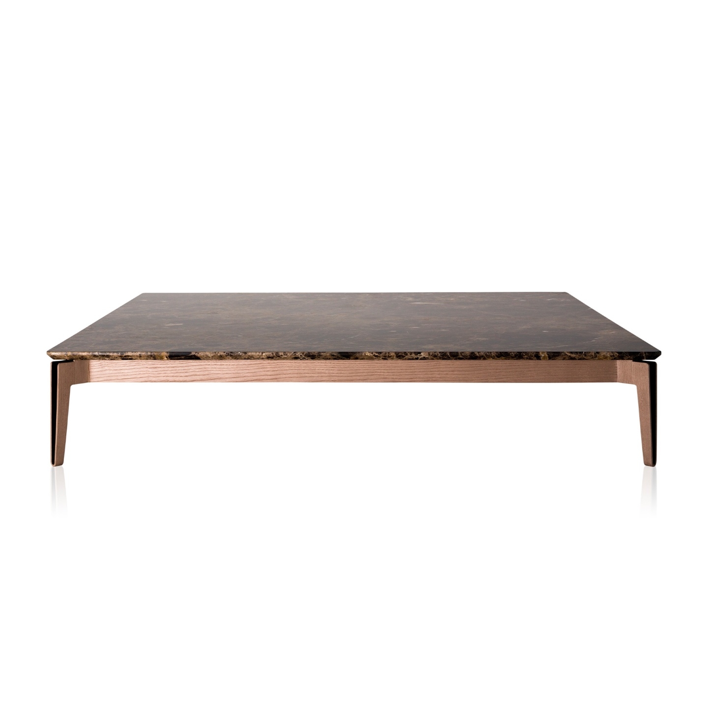 Leveza visual e solidez estão evidenciadas no traço preciso dessa composição. A lâmina de aço da estrutura parece realizar um movimento tangencial ao tampo, que por sua vez é feito de materiais nobres, como o mármore, o vidro e a madeira. Além disso, suas bordas são docemente arredondadas e as suas arestas suavemente chanfradas.