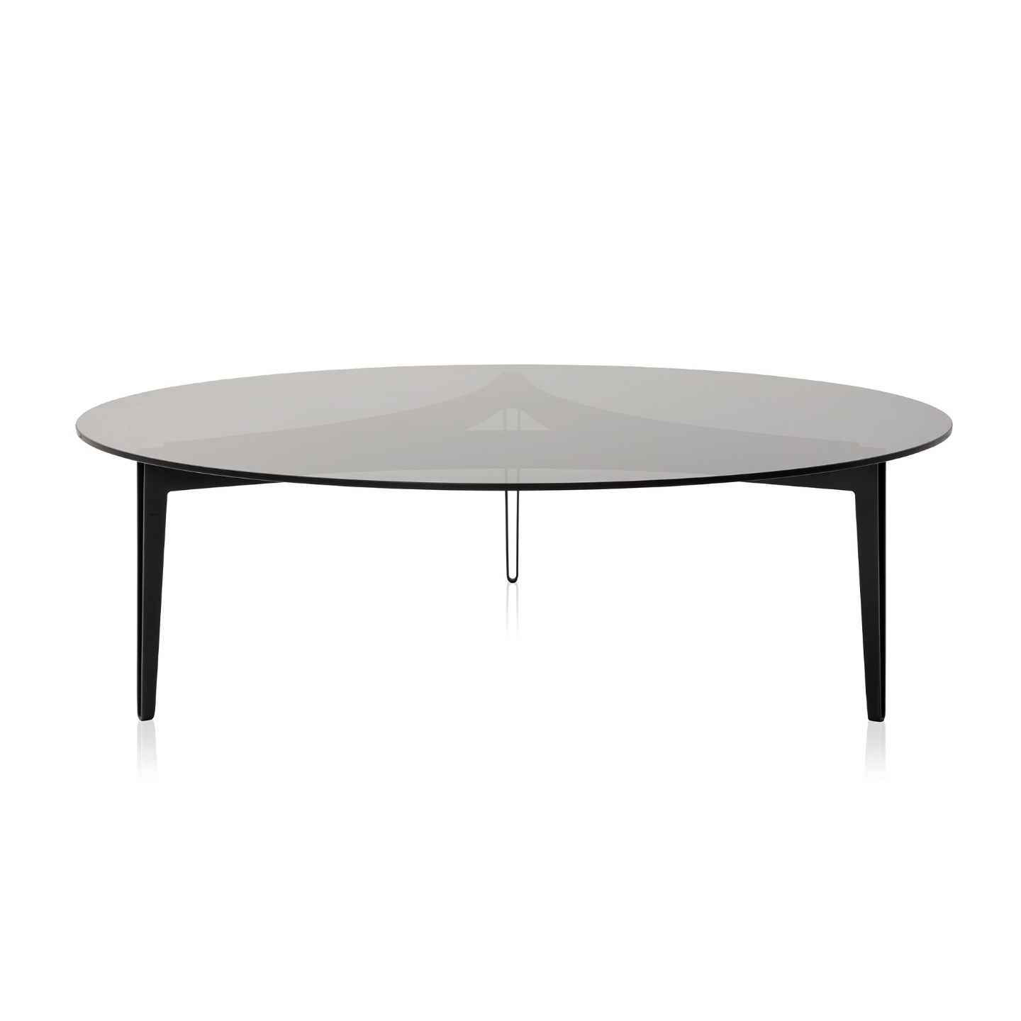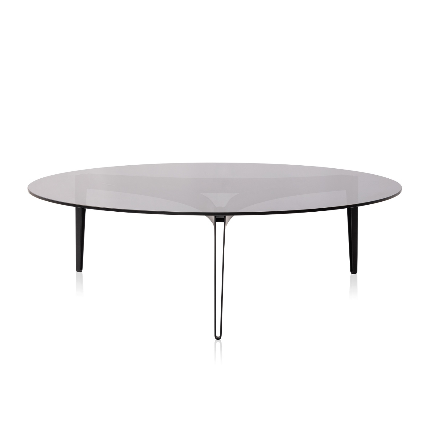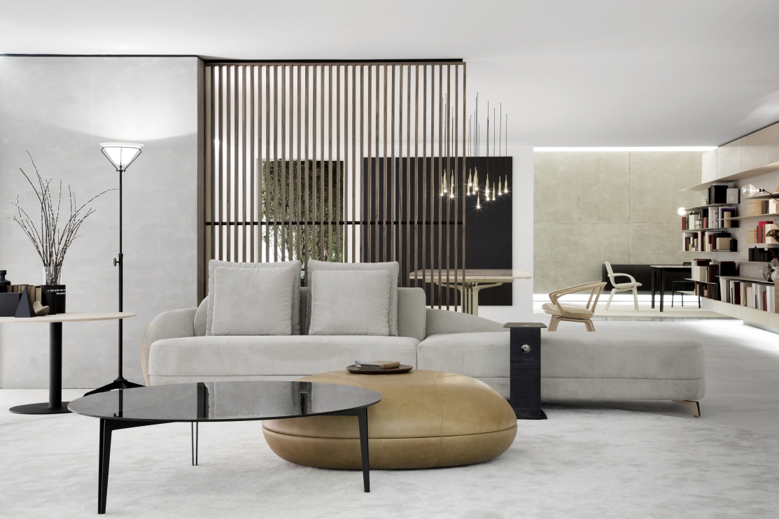 Leveza visual e solidez estão evidenciadas no traço preciso dessa composição. A lâmina de aço da estrutura parece realizar um movimento tangencial ao tampo, que por sua vez é feito de materiais nobres, como o mármore, o vidro e a madeira. Além disso, suas bordas são docemente arredondadas e as suas arestas suavemente chanfradas.