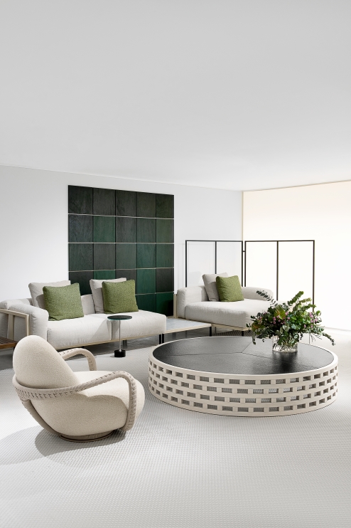 A coleção Brick, evoca a ideia dos pequenos blocos que, ao serem organizados, formam grandes superfícies—estruturas, invólucros, abrigos, muralhas. Mas aqui, essa composição se apresenta de maneira singular: não como uma repetição massiva, mas como uma metáfora visual, onde cada bloco é subtraído, deixando apenas as linhas verticais e horizontais que desenham a estrutura. O resultado é um jogo de cheios e vazios que imprime leveza e ritmo à peça. Esse padrão vazado, quase cinético, interage com a luz e a sombra, transformando-se conforme o ponto de vista do observador e conferindo dinamismo ao conjunto. Sobre essas bases, superfícies de mármore, vidro ou madeira ampliam as possibilidades compositivas, tornando a coleção Brick versátil e adaptável a diferentes contextos e estilos.