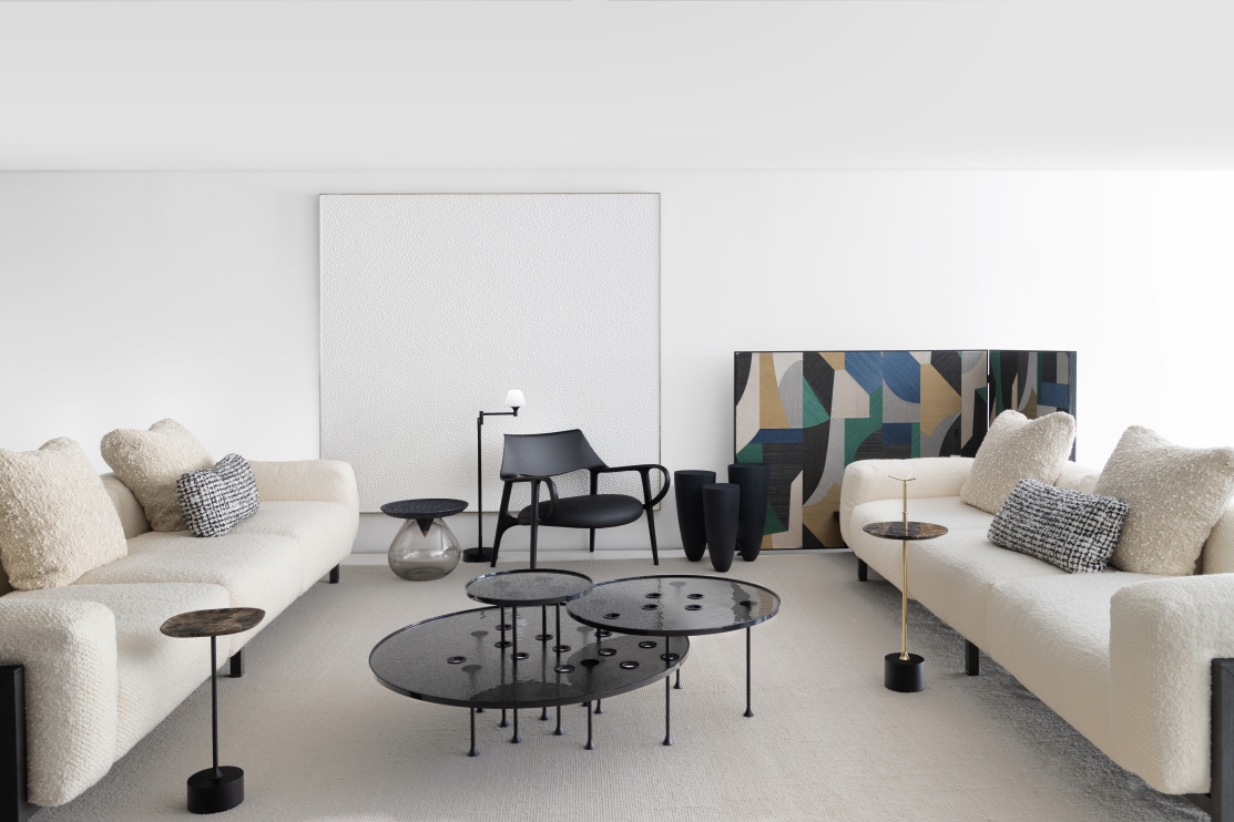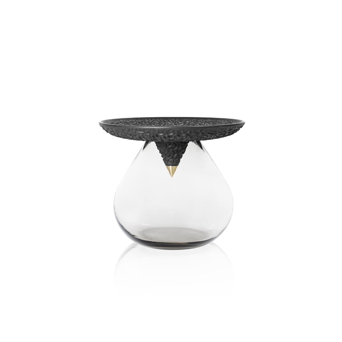 Cada peça é única, feita a mão onde as pequenas bolhas e as ligeiras alterações formam a característica orgânica que criam perspectivas diversas, a mesa de apoio agora na versão madeira forma uma atmosfera elegante e ousada na medida em que os materiais se combinam.