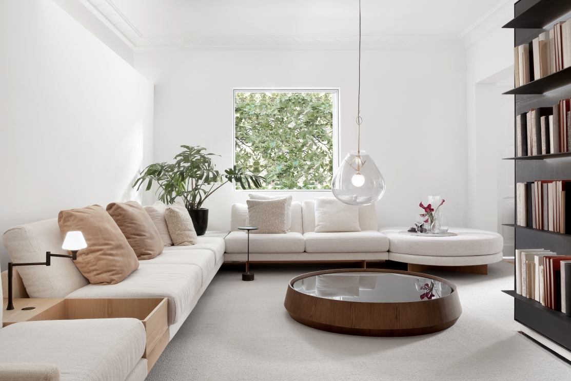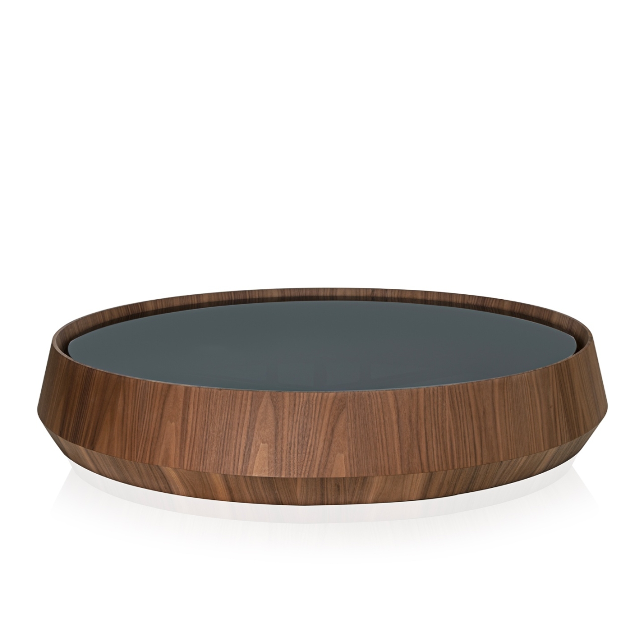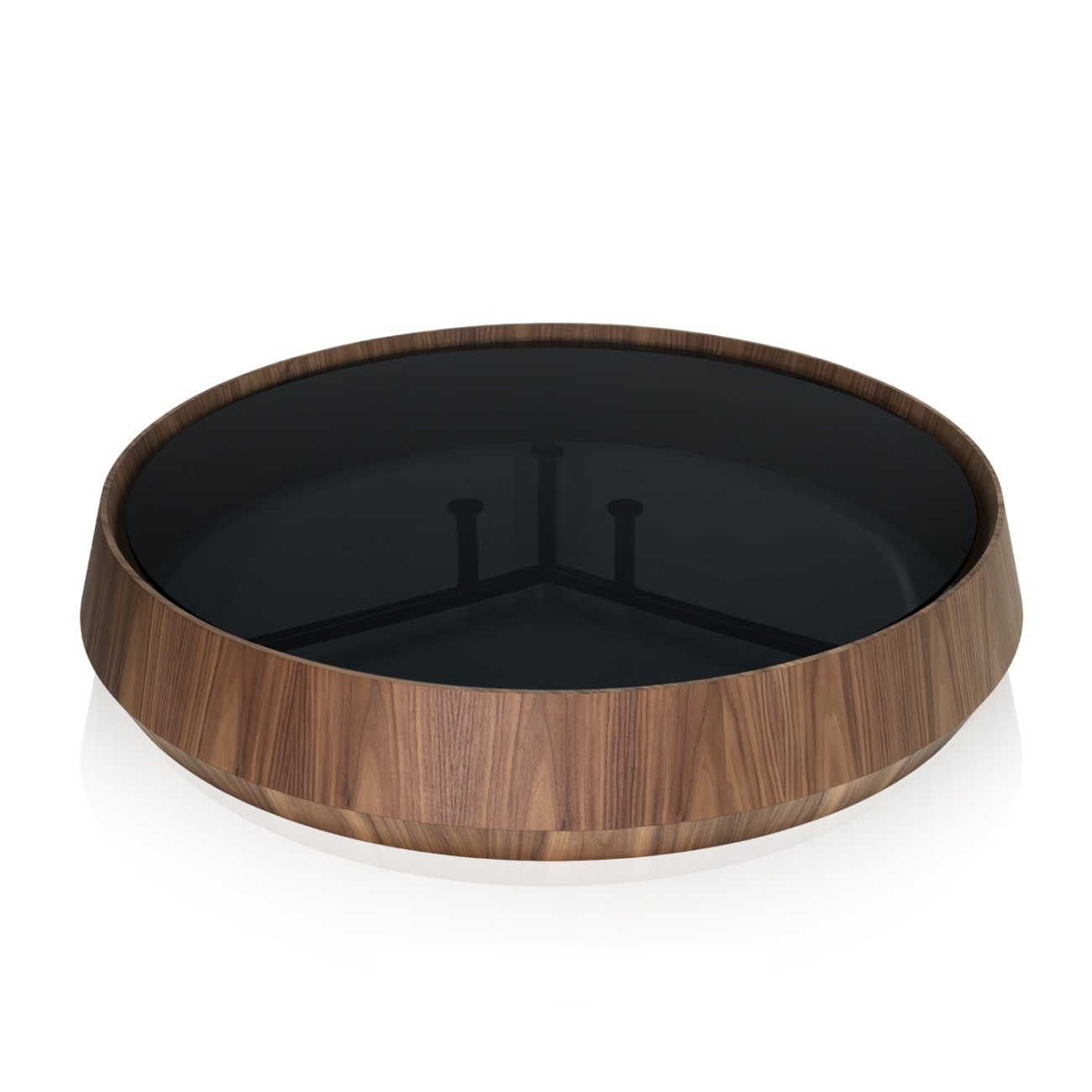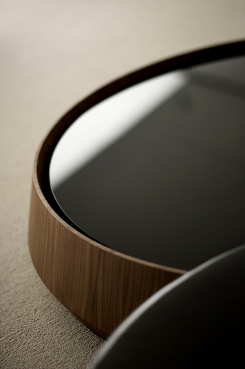 A coleção ROLL, aqui materializada na forma de uma mesa de centro, expressa um jogo de volumes circulares onde três eixos convergem ao centro. Esses elementos, conectados verticalmente, sustentam o tampo de vidro circular e criam ângulos inesperados que delineiam o perímetro da peça. Essa construção resulta em uma combinação de sutileza e imponência, caracterizando a identidade visual da coleção.