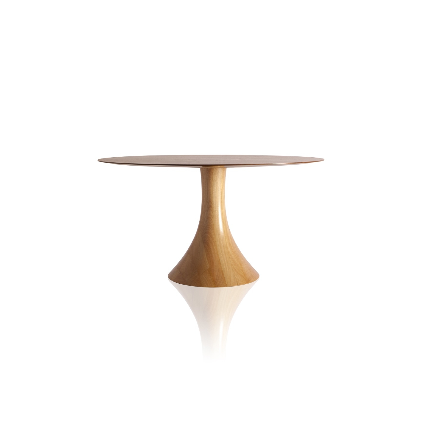 A forma fluida da estrutura é o principal elemento. O desenho contemporâneo da mesa não limita o desenho das cadeiras.