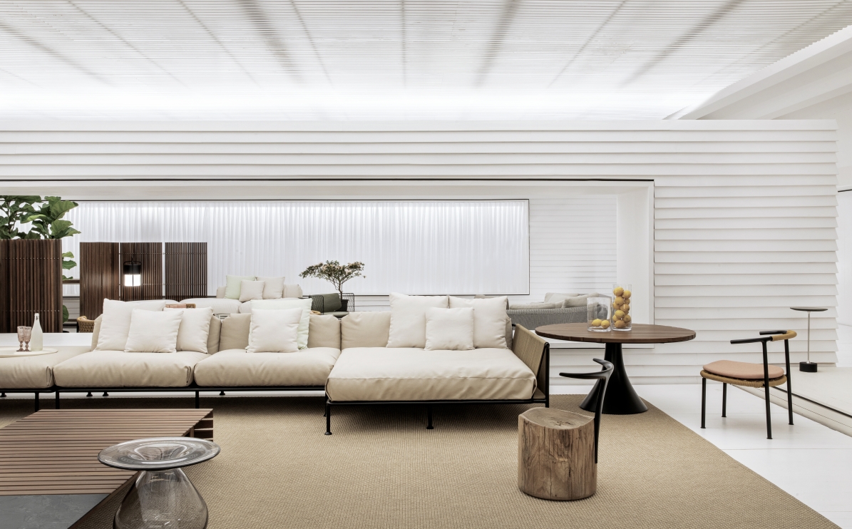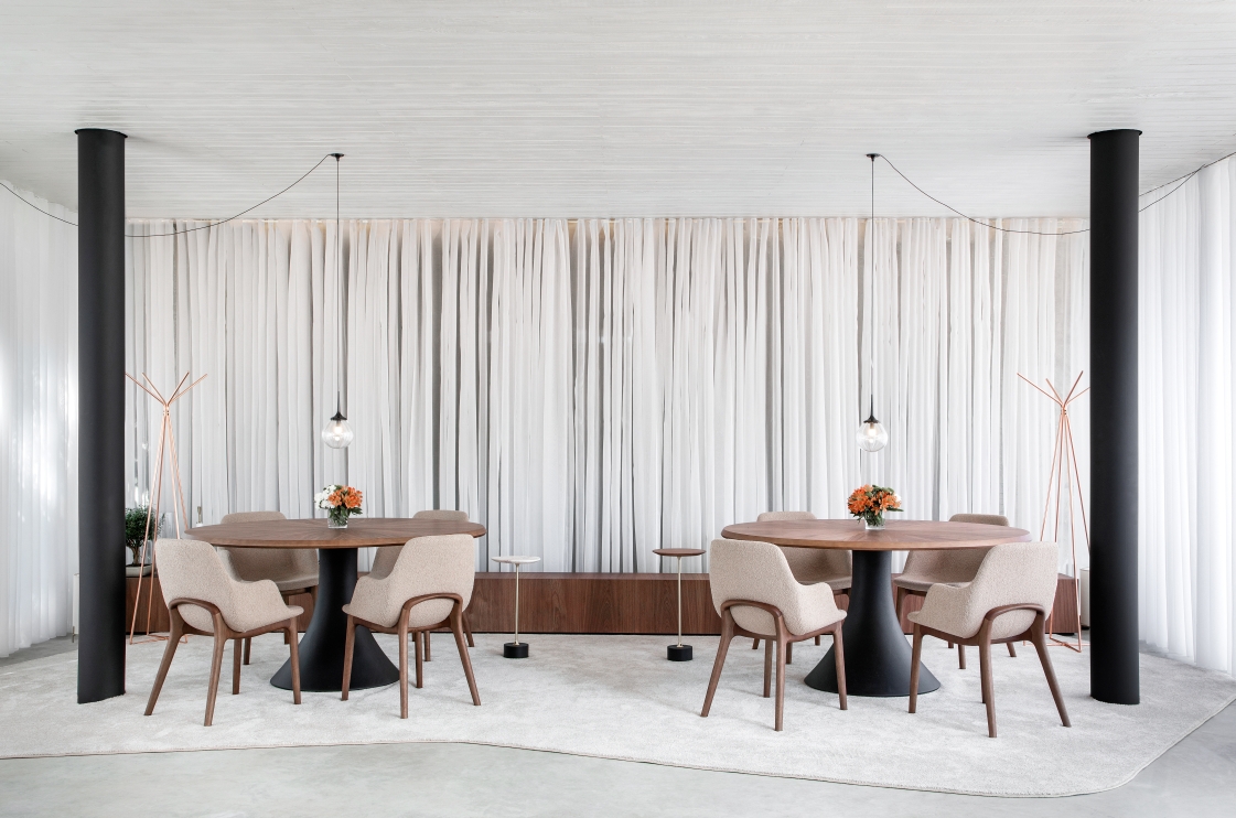 A forma fluida da estrutura é o principal elemento. O desenho contemporâneo da mesa não limita o desenho das cadeiras.