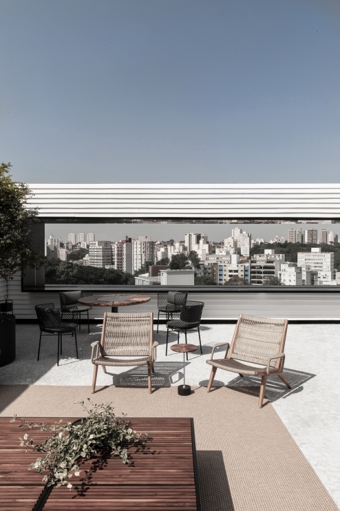 A forma fluida da estrutura é o principal elemento. O desenho contemporâneo da mesa não limita o desenho das cadeiras.