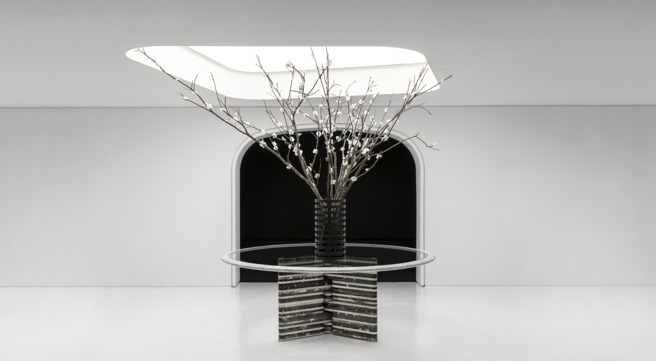 Seu nome faz alusão ao número três, refletindo suas três extensões estruturais, conectadas por finger joints que remetem aos tradicionais sistemas de dobradiça. Essa mesa traz uma abordagem singular: uma borda de mármore colada, justaposta a um amplo plano de vidro. A base, por sua vez, é composta por fragmentos de mármores e quartzos de diferentes origens e conformações, resultando em um conjunto heterogêneo e, ao mesmo tempo, definitivamente belo. Aqui, a matéria é utilizada em sua máxima potencialidade, resignificando elementos que poderiam ser descartados. O encontro desses fragmentos gera um efeito surpreendente: as transições naturais dos veios, as variações cromáticas dos sedimentos e os minerais que formam cada rocha tornam cada peça única — no sentido mais puro da palavra. Jamais haverá duas iguais. A combinação entre sensibilidade artística e capacidade técnica resulta em um conjunto harmonioso e expressivo, onde a função é superada pela emoção que só o design é capaz.