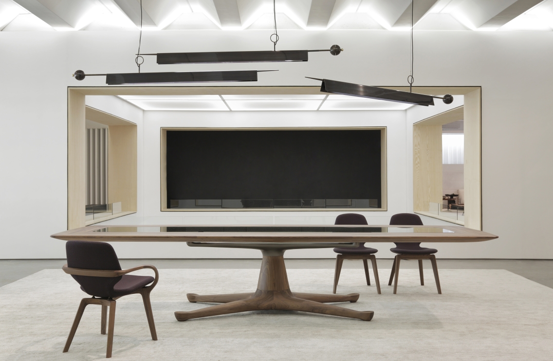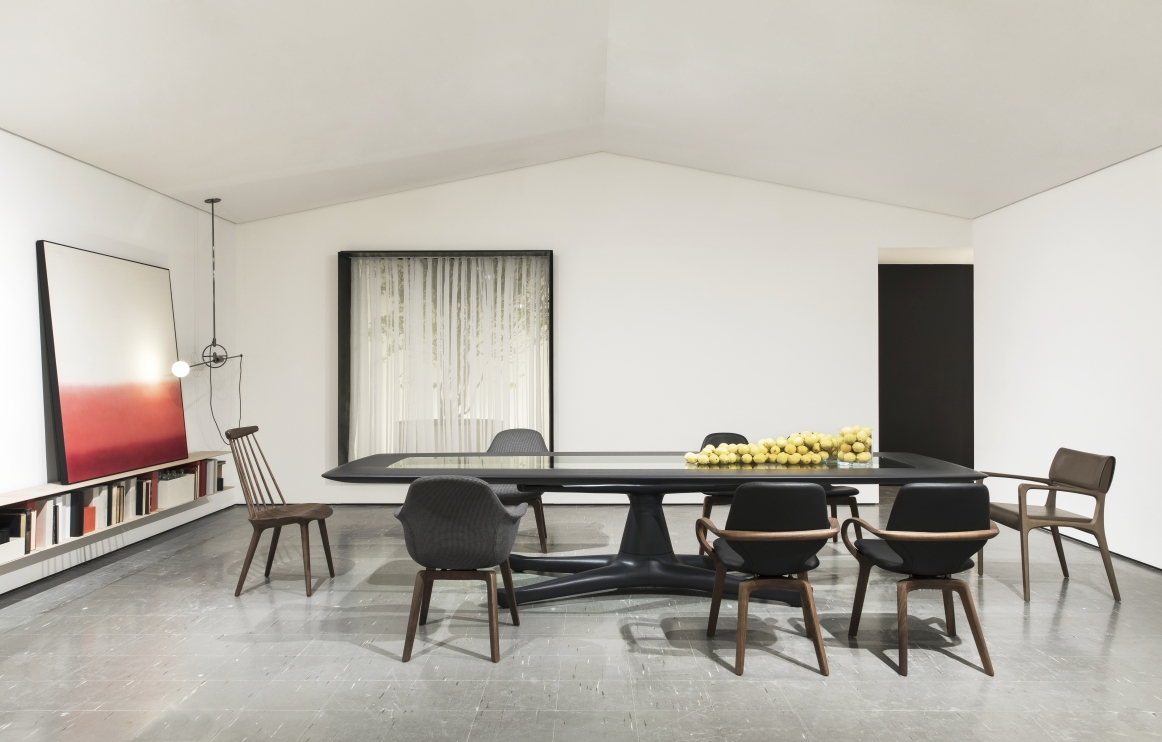 A mesa Lobb faz alusão às clássicas bases de mesas vitorianas. A robusta base com quatro pés é desafiada a suportar um tampo de dimensão generosa. A madeira aparece como protagonista, evidenciando toda a beleza e a performance característica do material.