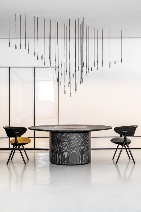 Desenho a partir de formas puras compõem a estrutura da mesa fazendo contraponto aos detalhes da superfície do tampo. Combinação que proporciona equilíbrio formal. Uma mesa de jantar combinada a materiais diversos configuram este produto como uma peça dinâmica e funcional.