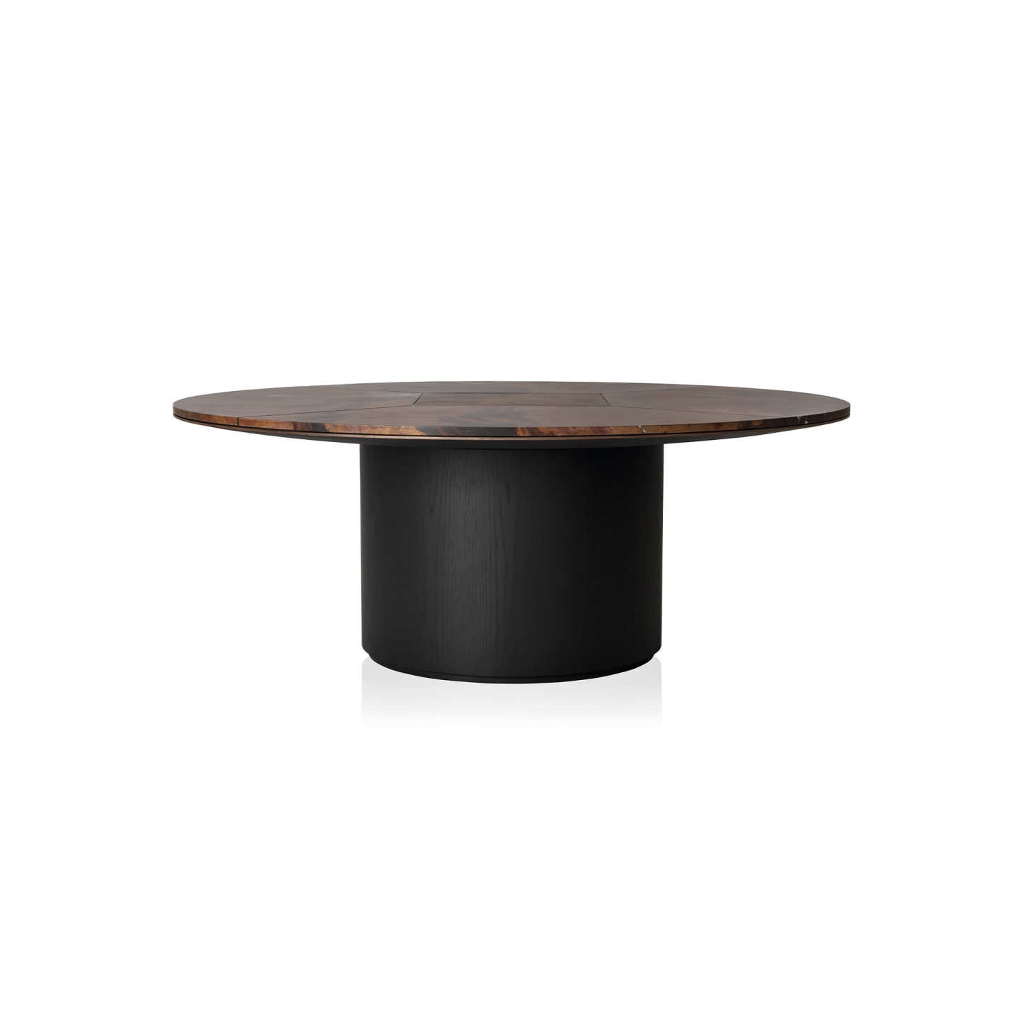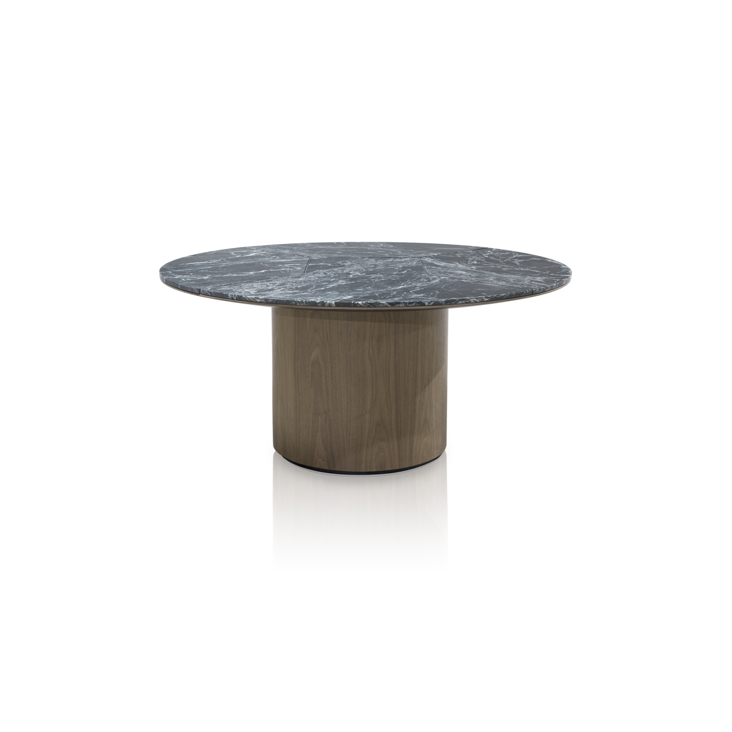 Desenho a partir de formas puras compõem a estrutura da mesa fazendo contraponto aos detalhes da superfície do tampo. Combinação que proporciona equilíbrio formal. Uma mesa de jantar combinada a materiais diversos configuram este produto como uma peça dinâmica e funcional.