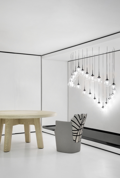 A rigidez geométrica, as espessuras generosas e o tampo em materiais distintos caracterizam a família de produtos SAINT. Sua estrutura parte de uma matriz de linhas puristas, com pés em construção em travas superiores, que servem de solução construtiva para suportar diferentes formatos, sem prejudicar a integridade estrutural ou a forma. O centro em mármore pode ser giratório para facilitar o serviço.