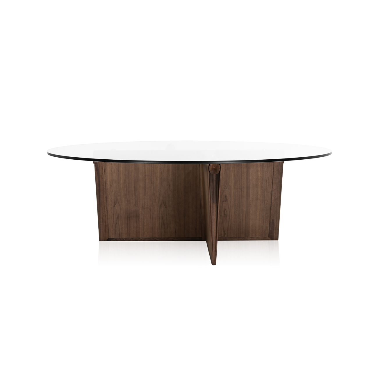 A mesa de jantar Voile transcende o conceito tradicional de uma mesa e se afirma como uma escultura funcional, um objeto que instiga, emociona e estabelece um diálogo sofisticado entre forma, materialidade e espaço. A geometria da base permite diferentes configurações de tampos, sejam circulares ou retangulares, evidenciando a flexibilidade do desenho e a versatilidade da estrutura. O tampo de vidro, além de potencializar a leveza visual da peça, revela sua estrutura central – um dorso imponente e, ao mesmo tempo, sutil.