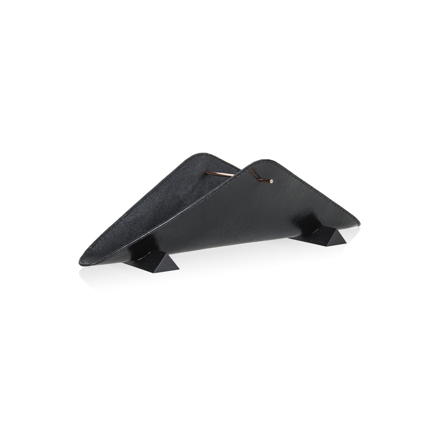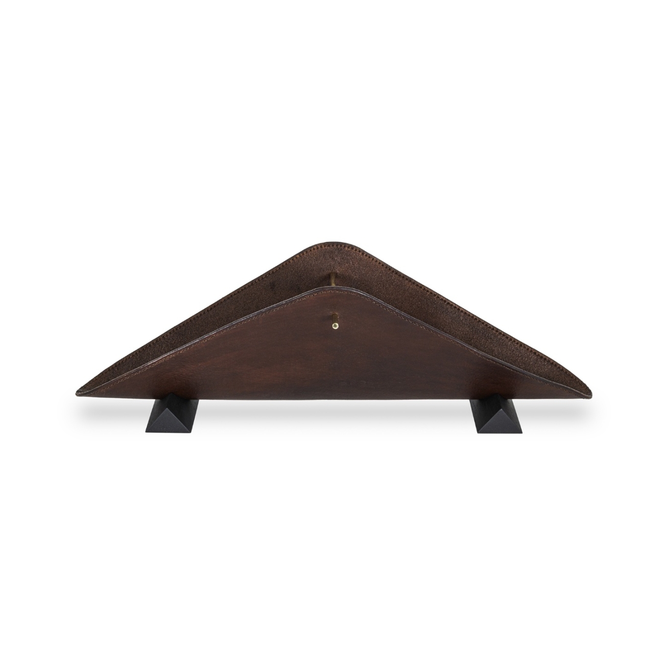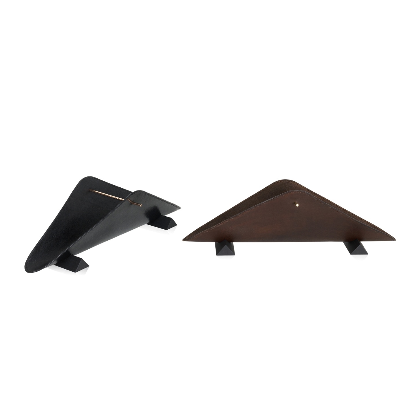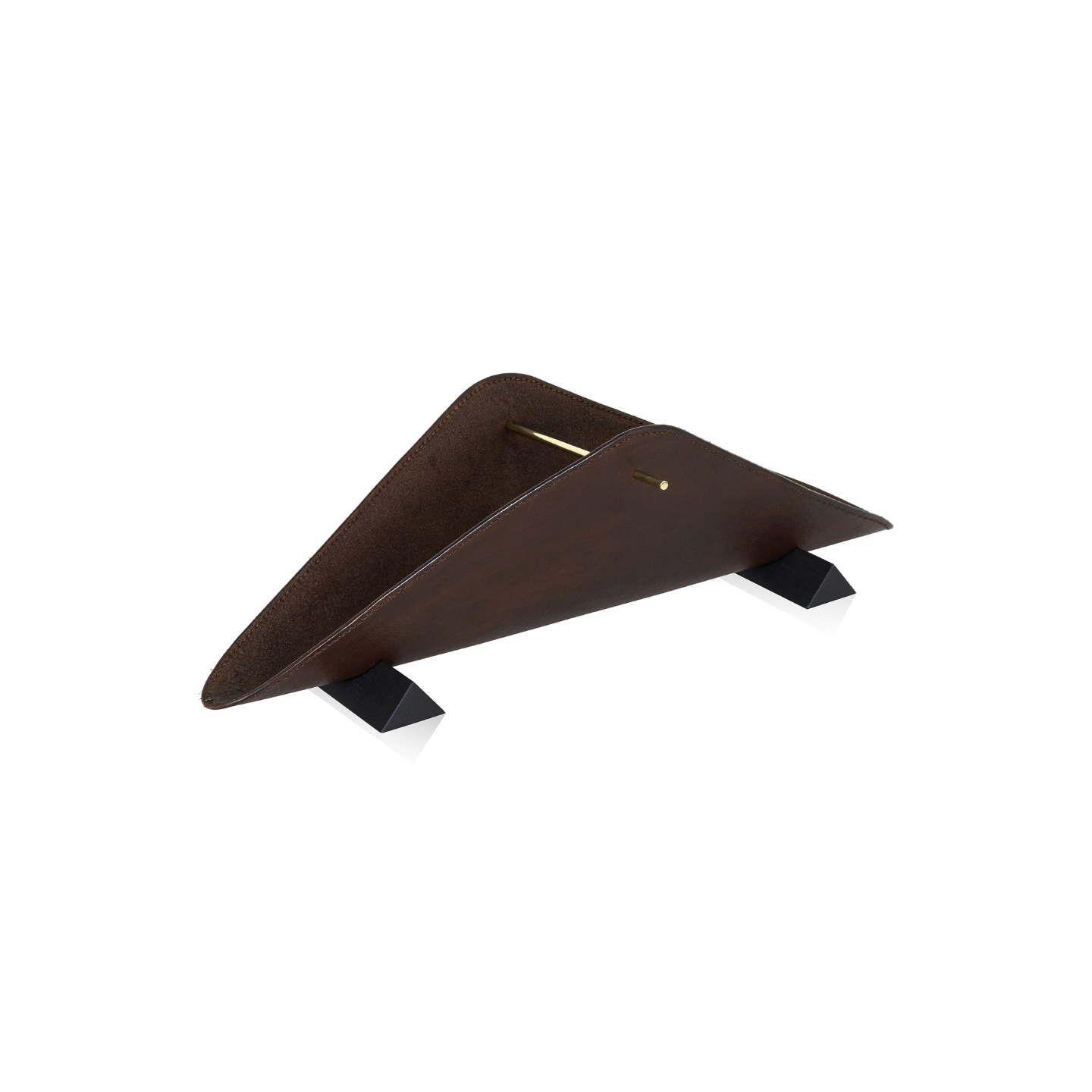 Base: Madeira maciça tingida Estrutura: Couro Pegador: Metal