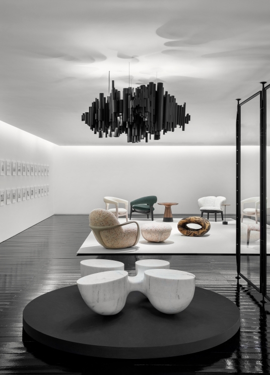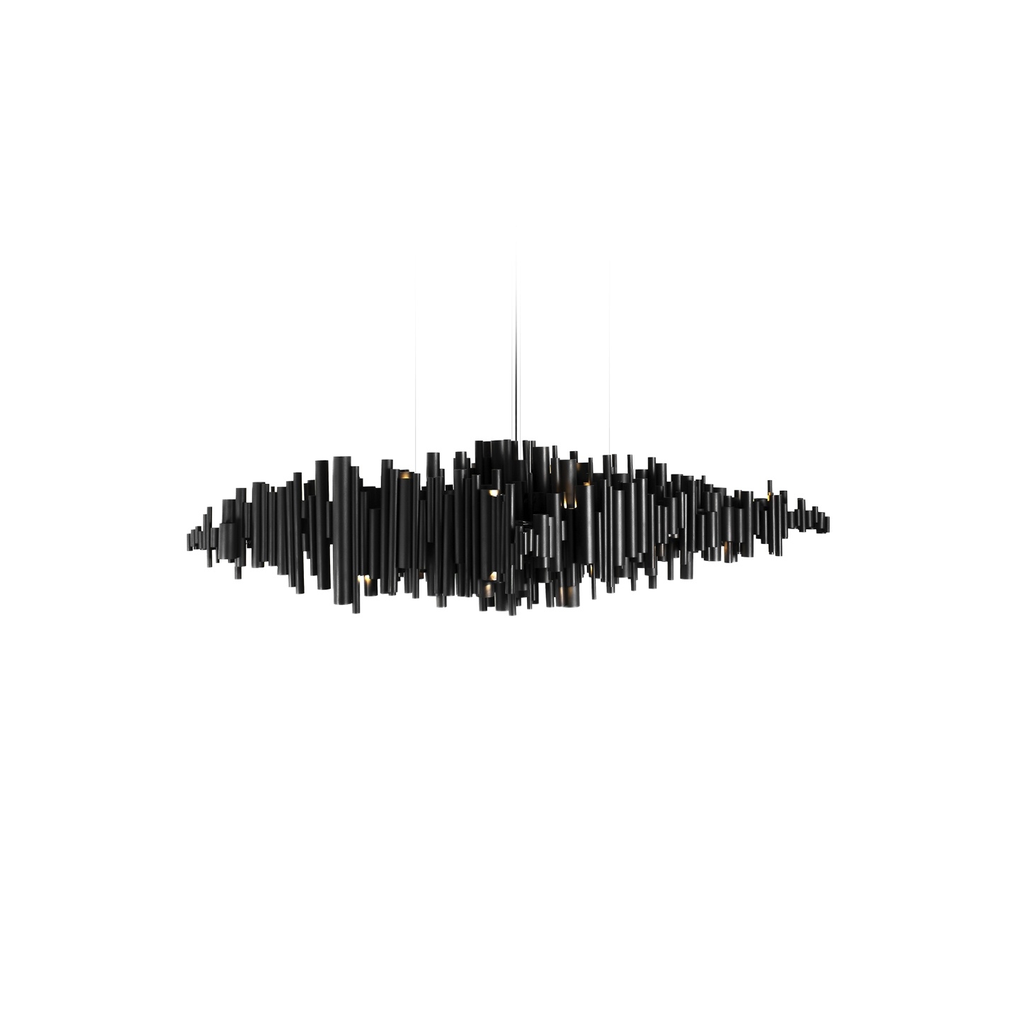 Inusitado e instigante, a luminária pendente AGE transcende sua função, sendo um elemento escultórico suspenso, feito a partir da união delicada de cilindros metálicos com diferentes dimensões e espessuras, que formam um losango, capaz de produzir uma iluminação difusa e bidirecional.