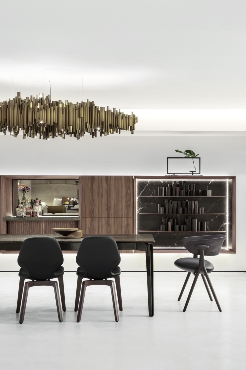 Inusitado e instigante, a luminária pendente AGE transcende sua função, sendo um elemento escultórico suspenso, feito a partir da união delicada de cilindros metálicos com diferentes dimensões e espessuras, que formam um losango, capaz de produzir uma iluminação difusa e bidirecional.