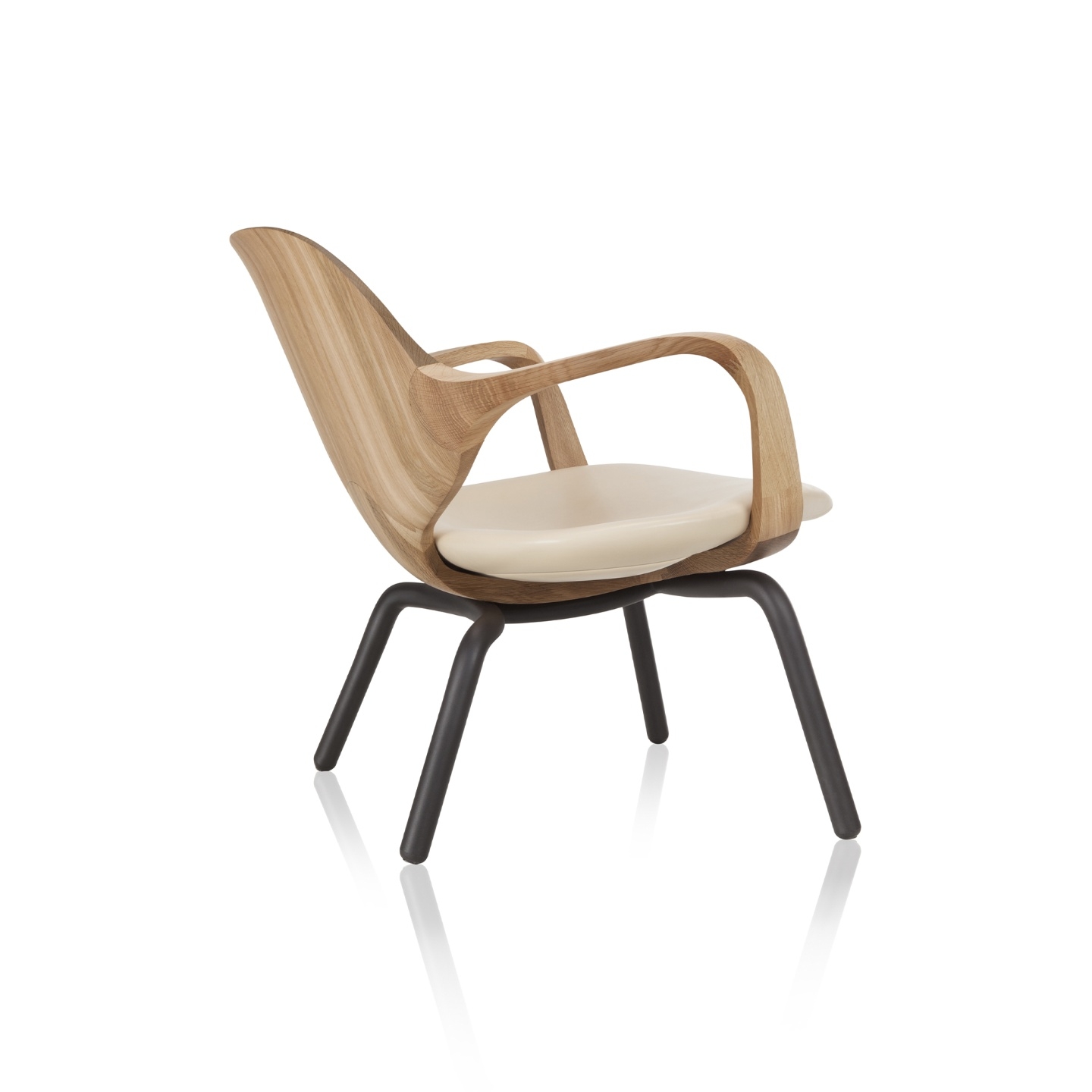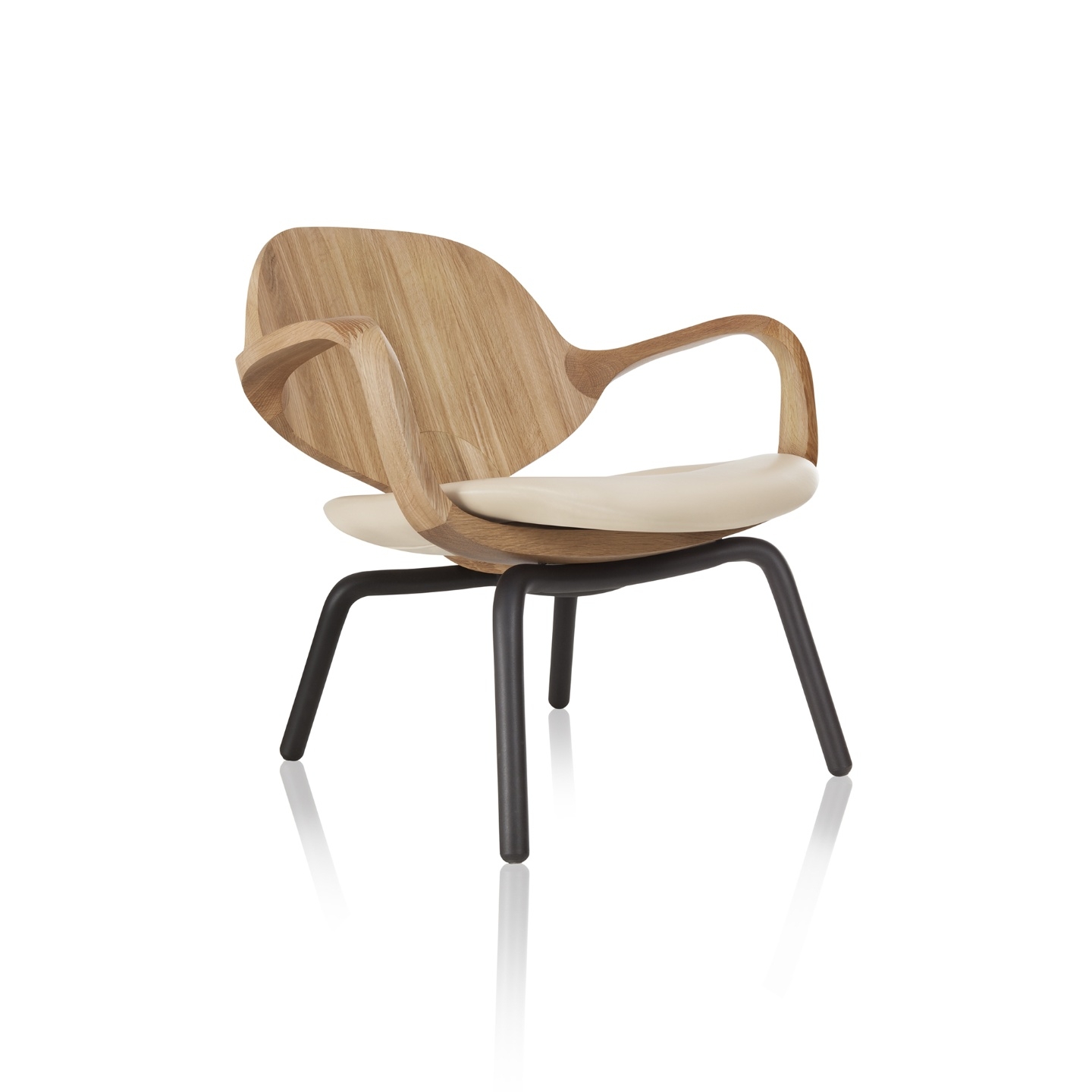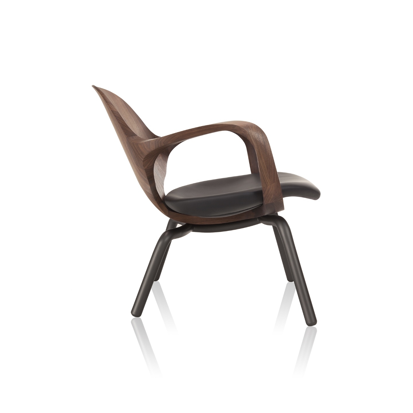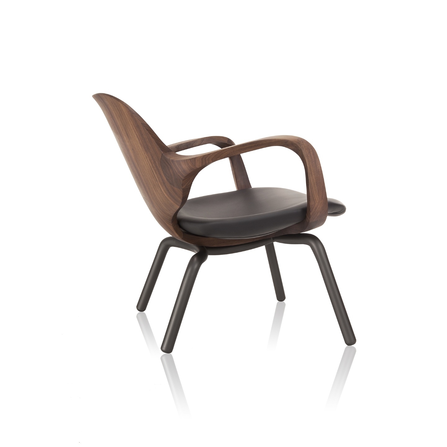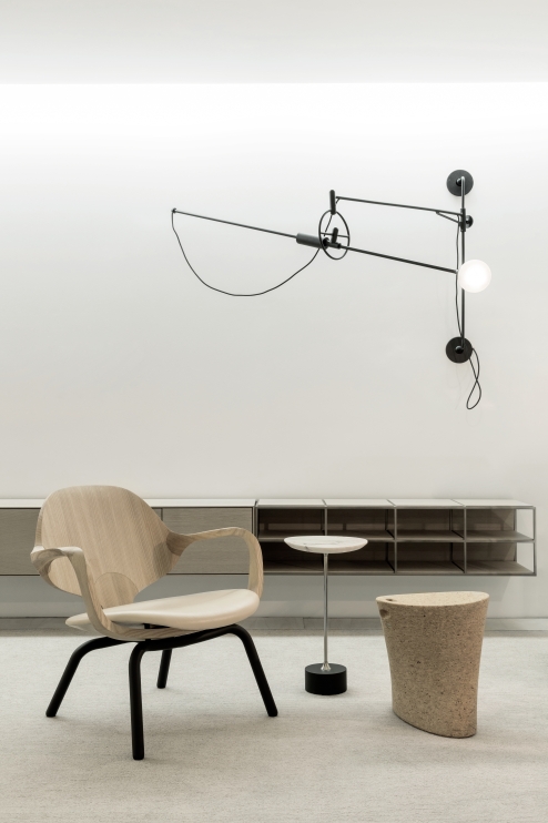 O desenho de traço fluido, inspirado na arte cicládica, confere leveza e delicadeza a cadeira. As formas anatômicas apoiam o tronco em sua totalidade enquanto as torções e arestas chanfradas parecem transpor o limite da resistência da madeira.