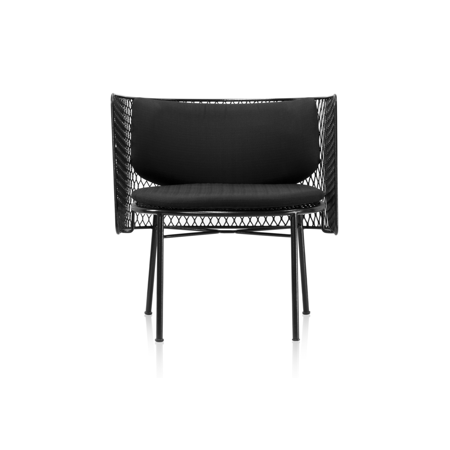 Estrutura: Metal, aço carbono pintado Assento: Estofado revestido em tecido Encosto: Estofado revestido em tecido