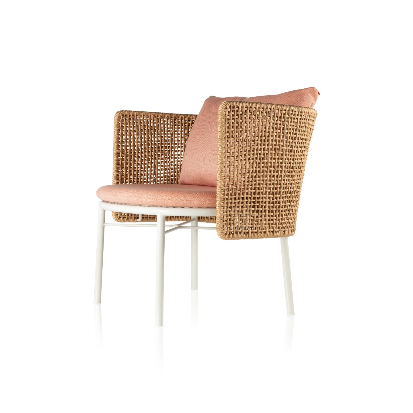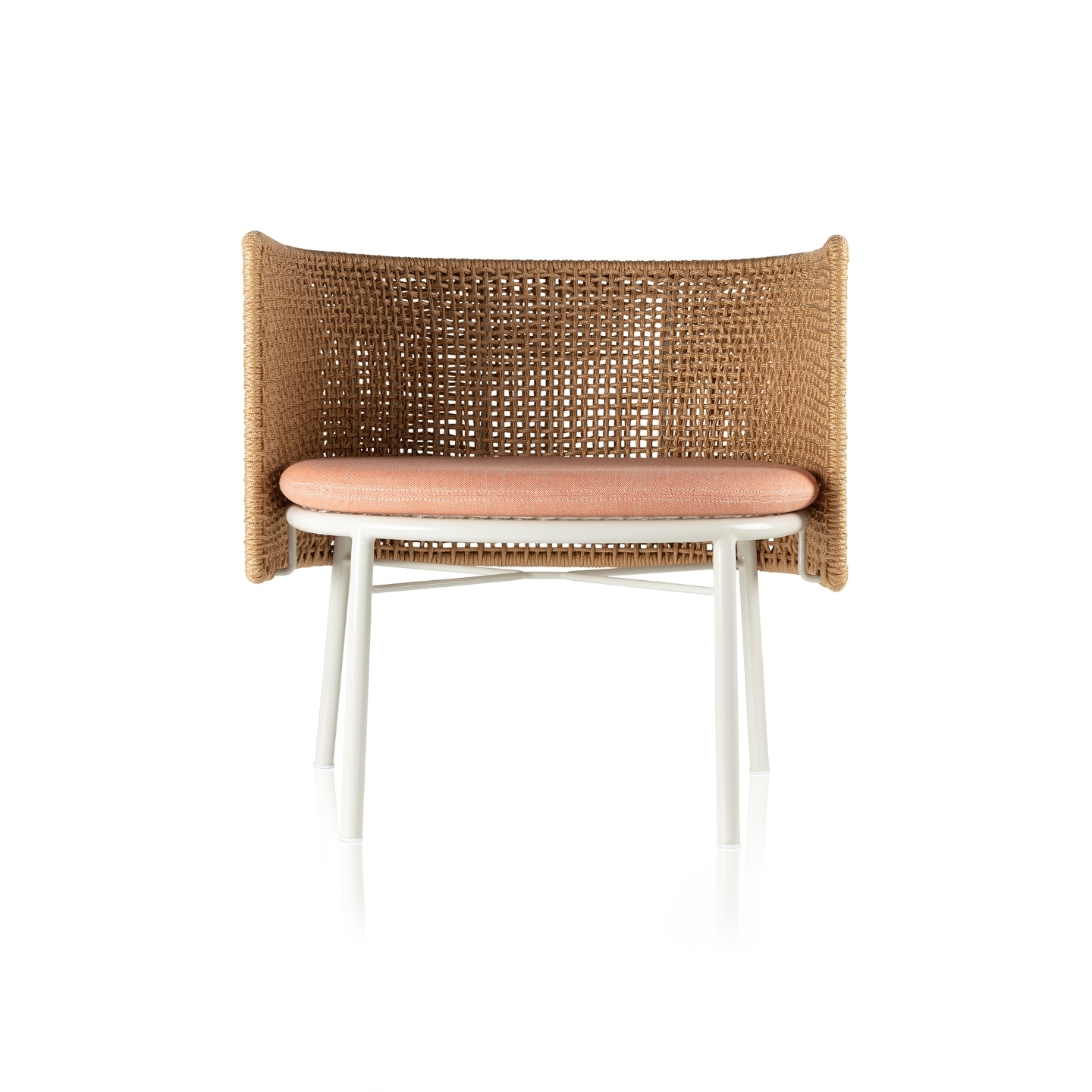 Estrutura: Metal, pintura eletroestática, aço carbono pintado Encosto: Corda náutica, estofado revestido em tecido Assento: Estofado revestido em tecido