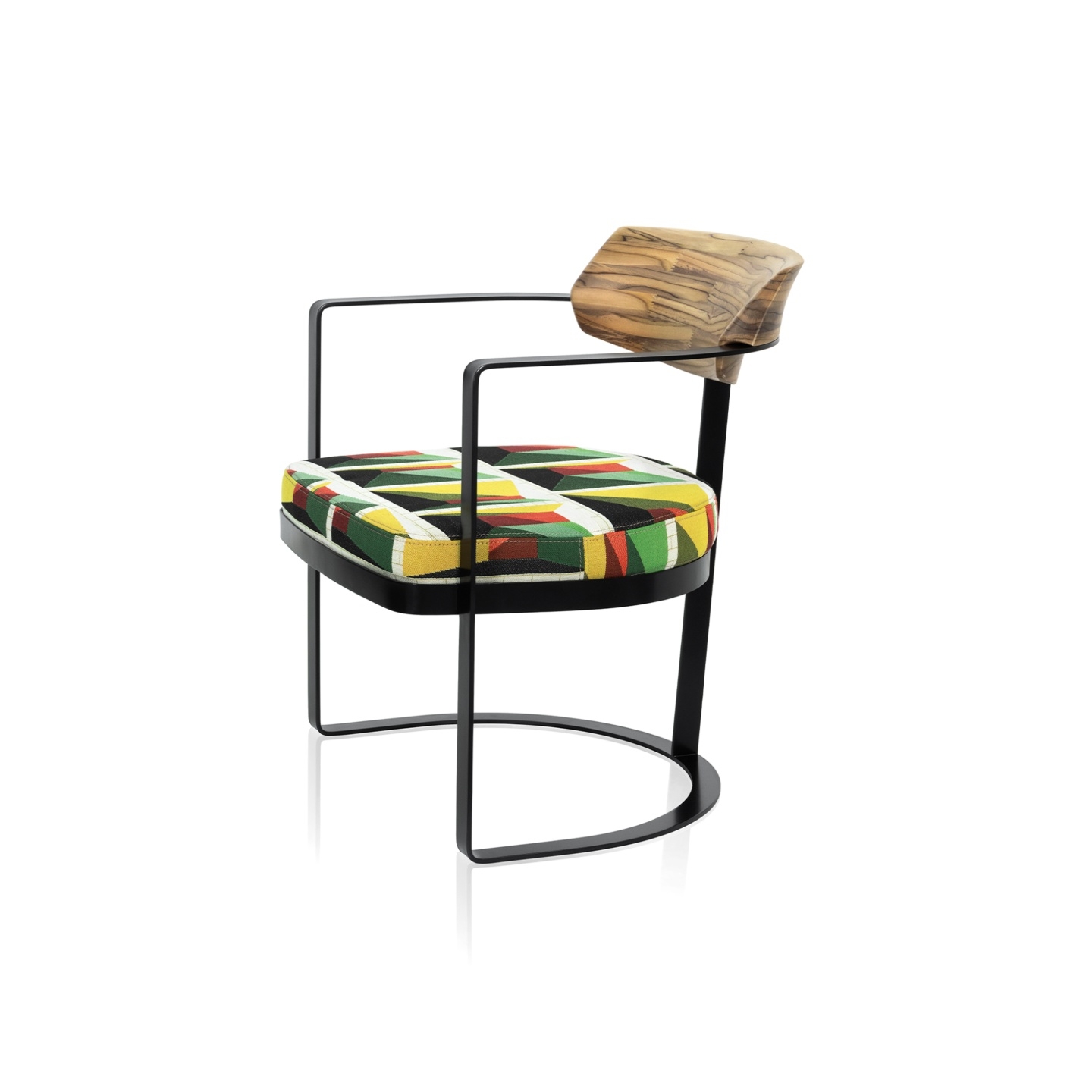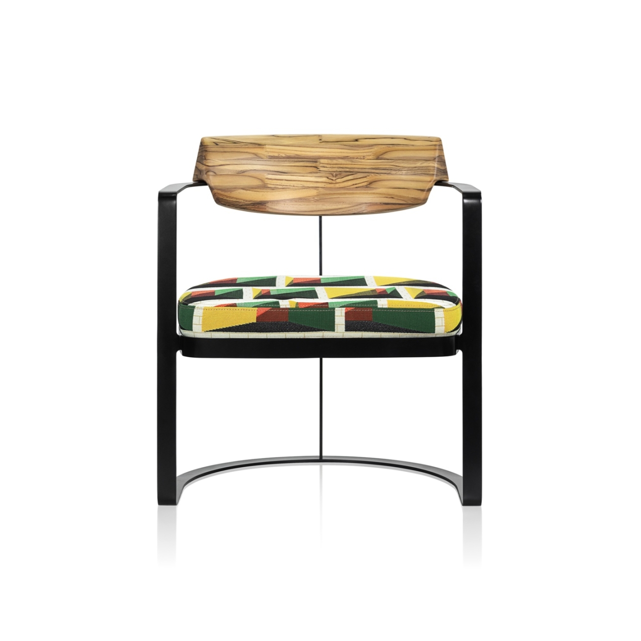 A coleção Due combina proporções e delicadeza de produtos indoor com a durabilidade de materiais usados em produtos outdoor. Sua estrutura apresenta um design clássico com três suportes verticais conectados por dois arcos, formando braços e base. O encosto de madeira parece flutuar sobre a estrutura, criando uma sensação de leveza, enquanto o assento estofado é sobreposto na base com corda náutica para permitir a permeabilidade da água em caso de chuva.