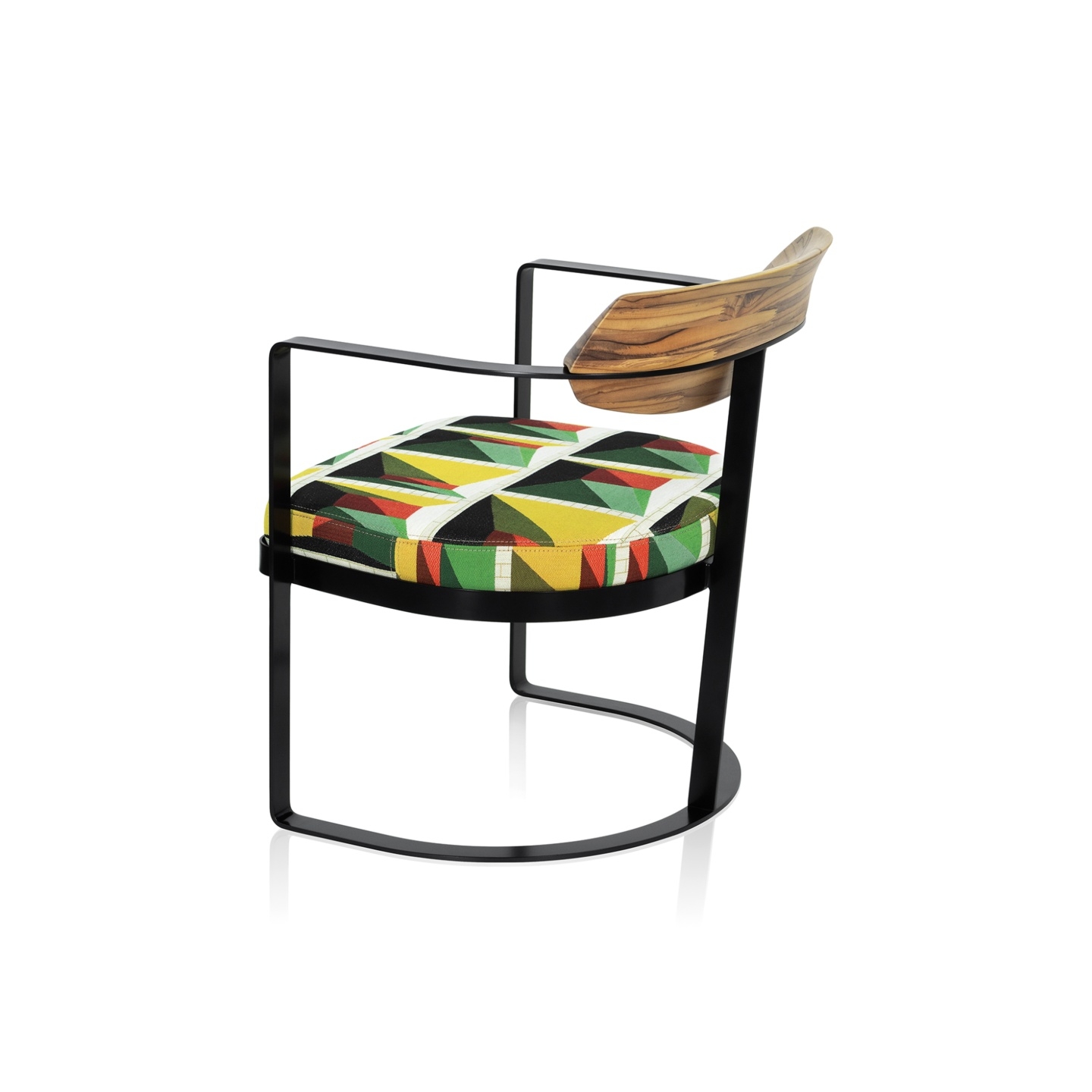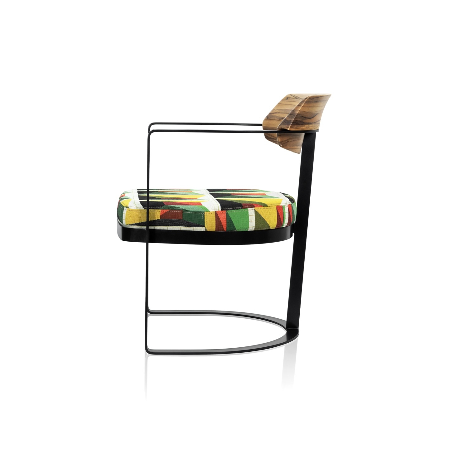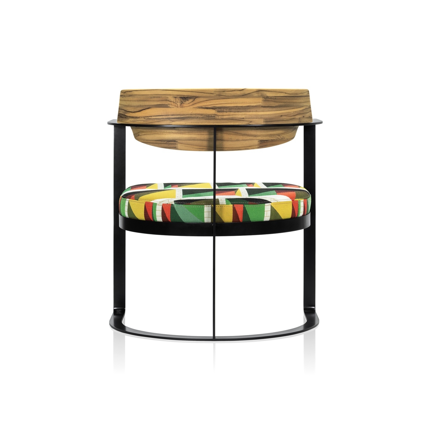 Estrutura: Metal, pintura eletroestática, aço carbono pintado Encosto: Madeira maciça, madeira maciça tingida Assento: Corda náutica, estofado revestido em tecido
