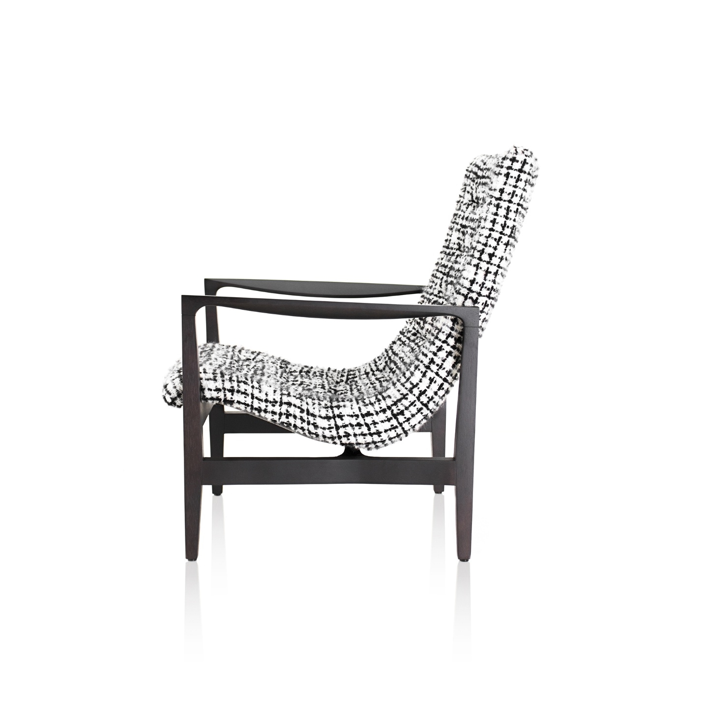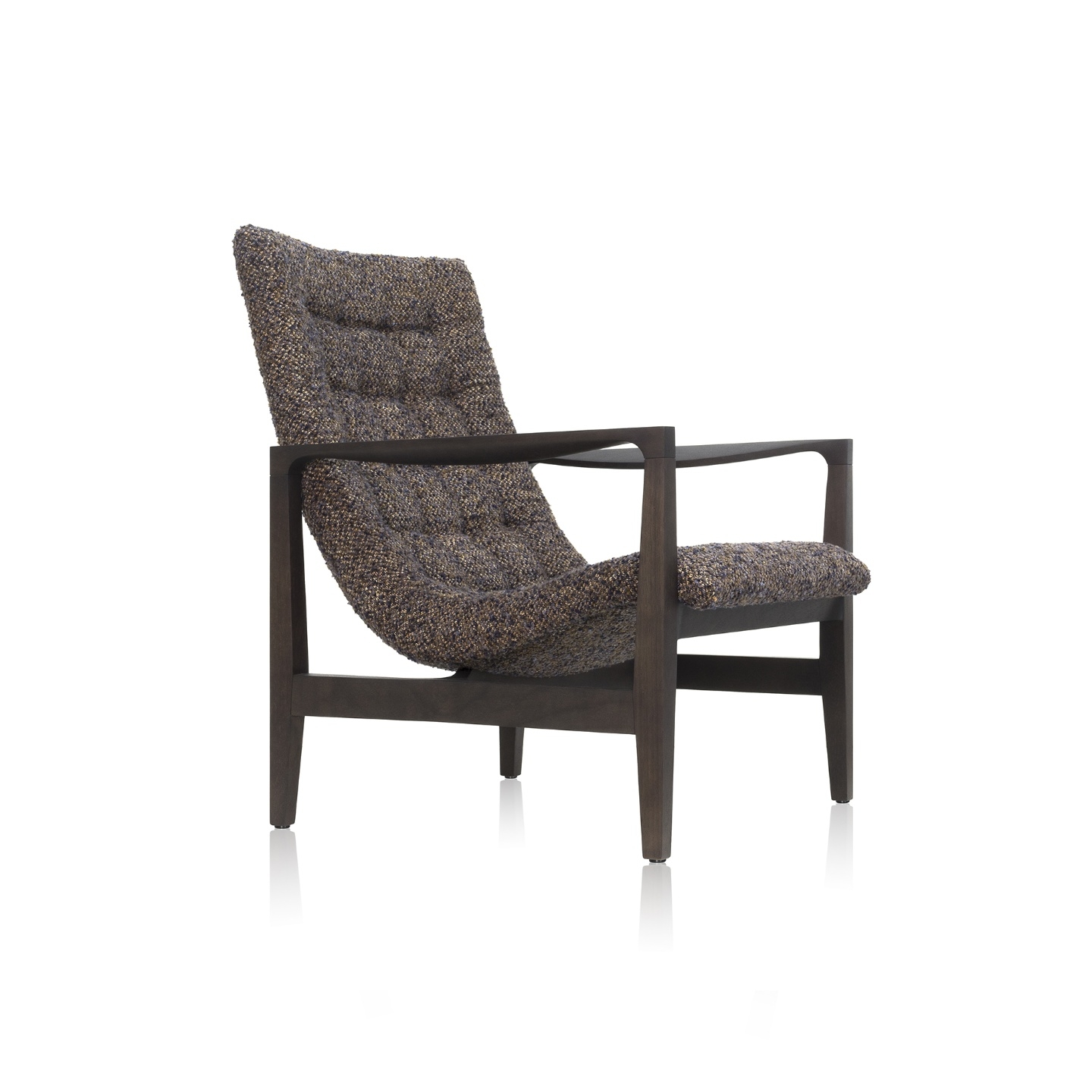 Uma peça amistosa com detalhes sutis e bem resolvidos. Os braços são levemente chanfrados e arredondados enquanto o assento e o encosto estofados parecem flutuar na estrutura de madeira.