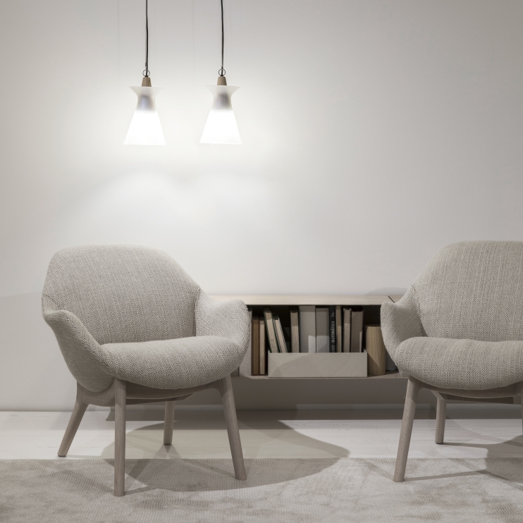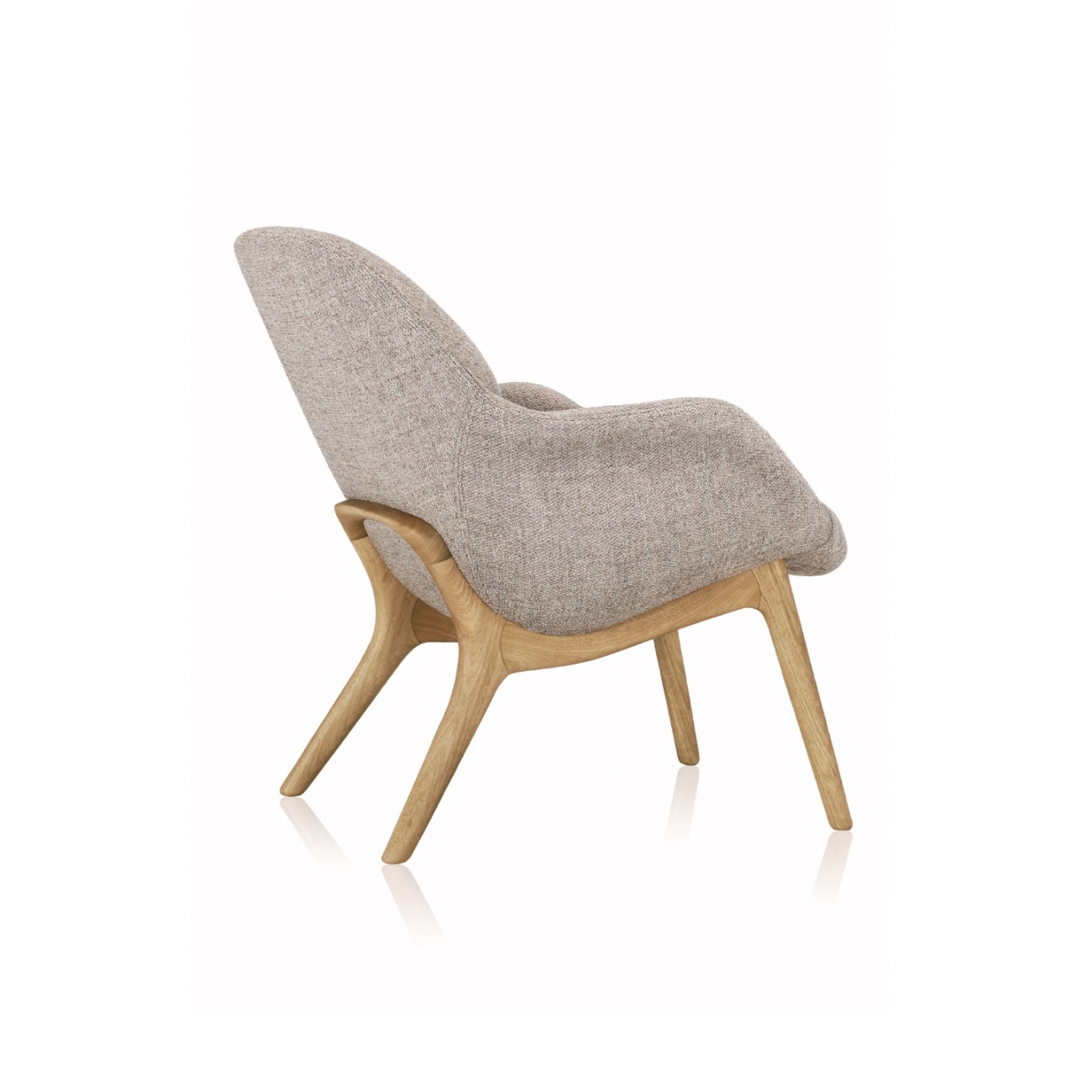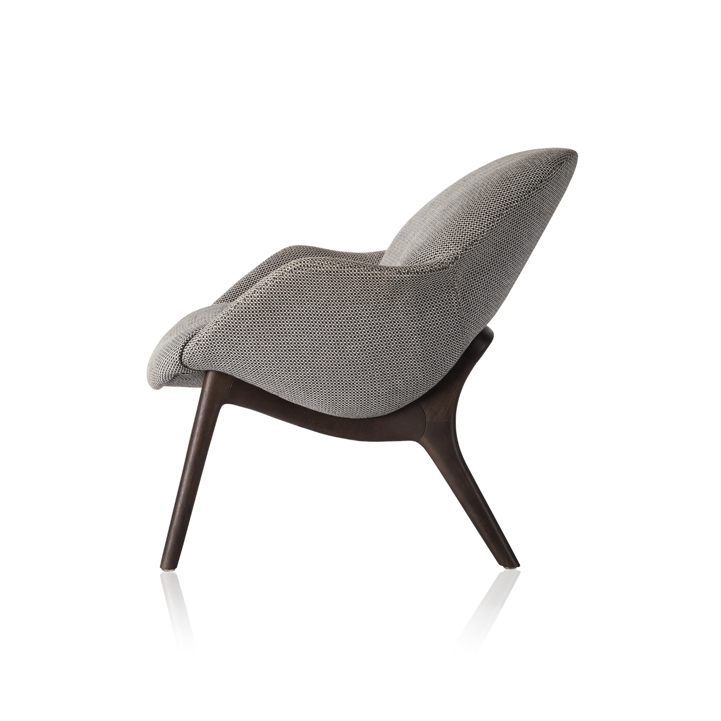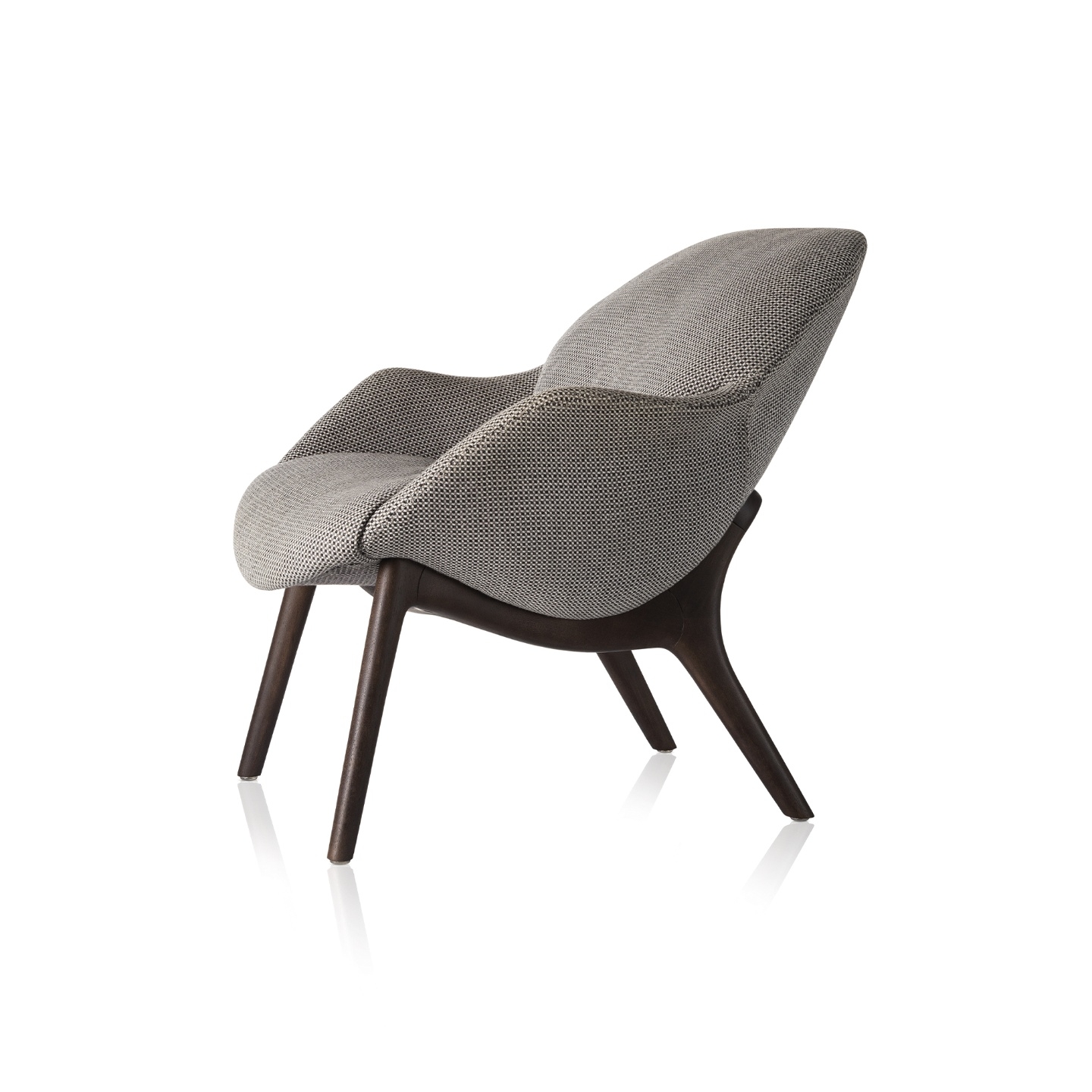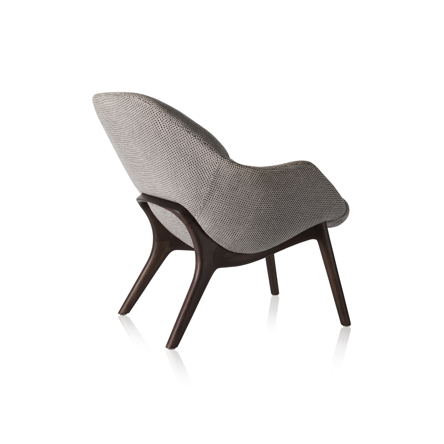 Seu forte apelo formal prende o olhar nas curvas e evidencia o material da estrutura, que parece abraçar o assento e o encosto estofado. Seu formato em concha prioriza o conforto e o seu conjunto estético orgânico mostra o perfeito equilíbrio entre formas e volumes dos móveis de traços modernistas.