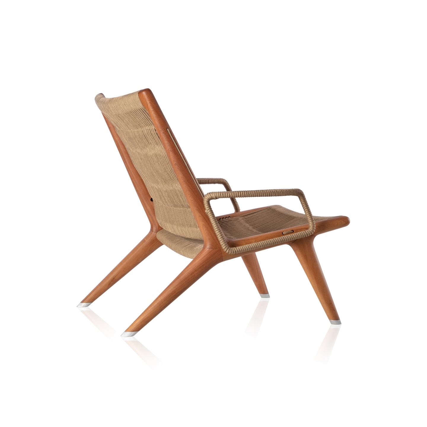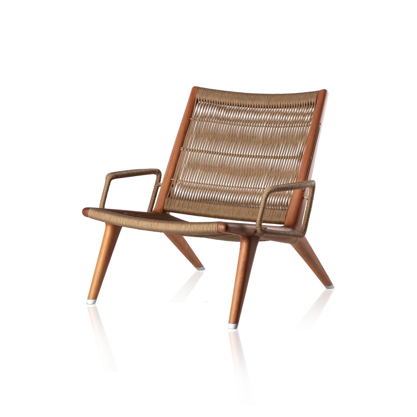 Estrutura: Lâmina natural, lâmina tingida Assento: Corda Encosto: Corda Braços: Metal, corda náutica Sapatas: Metal