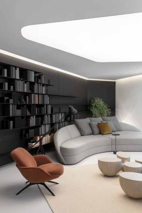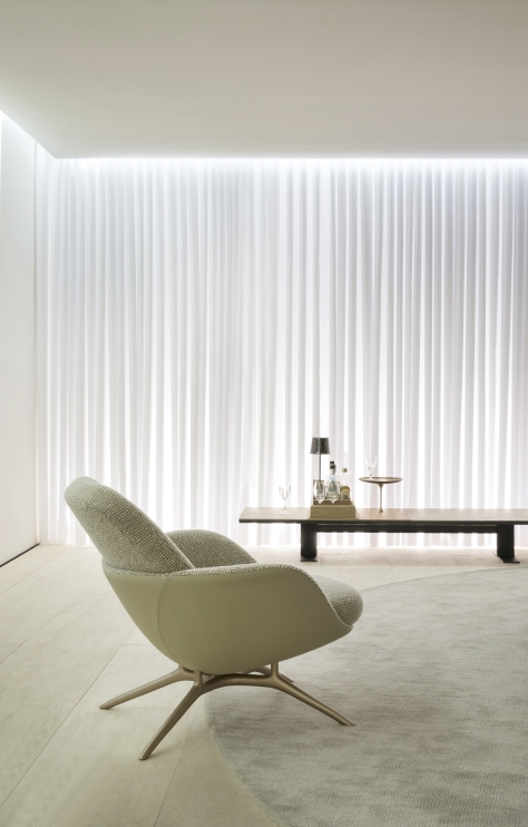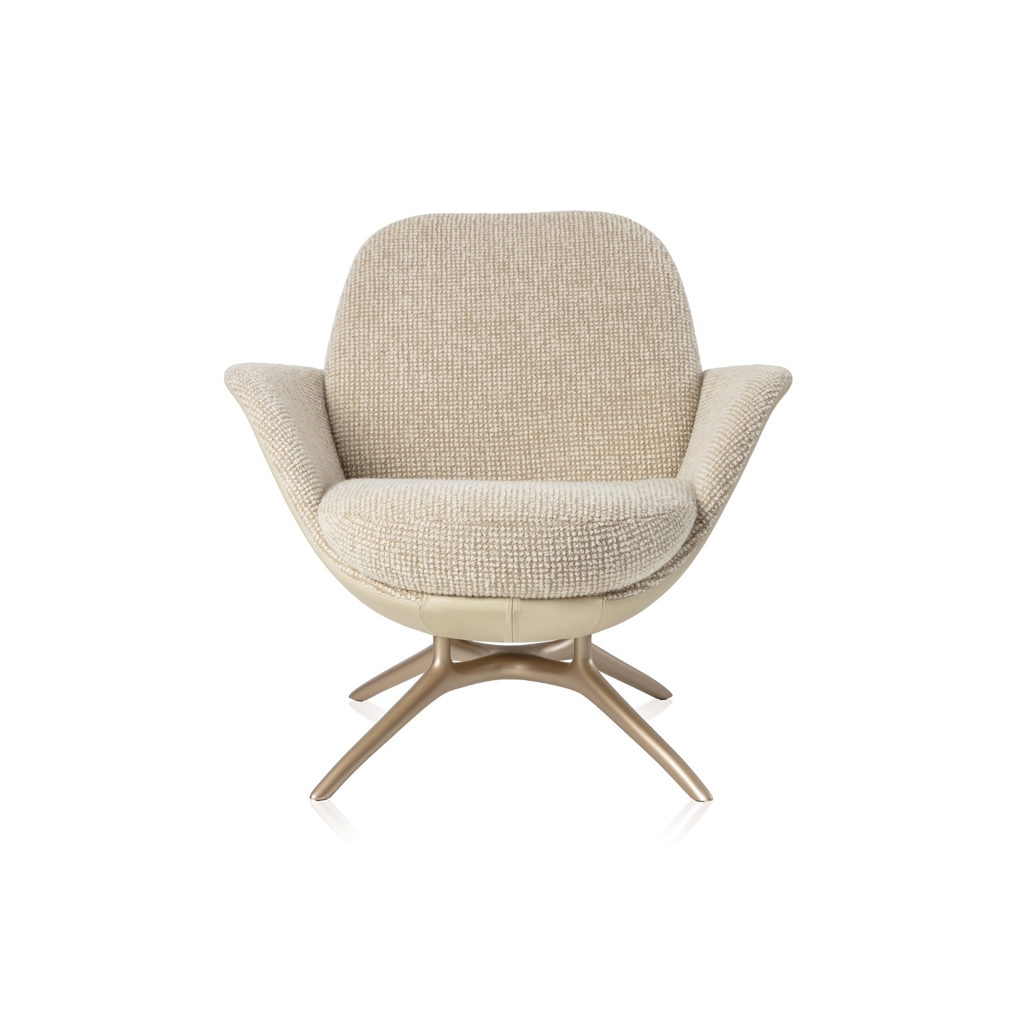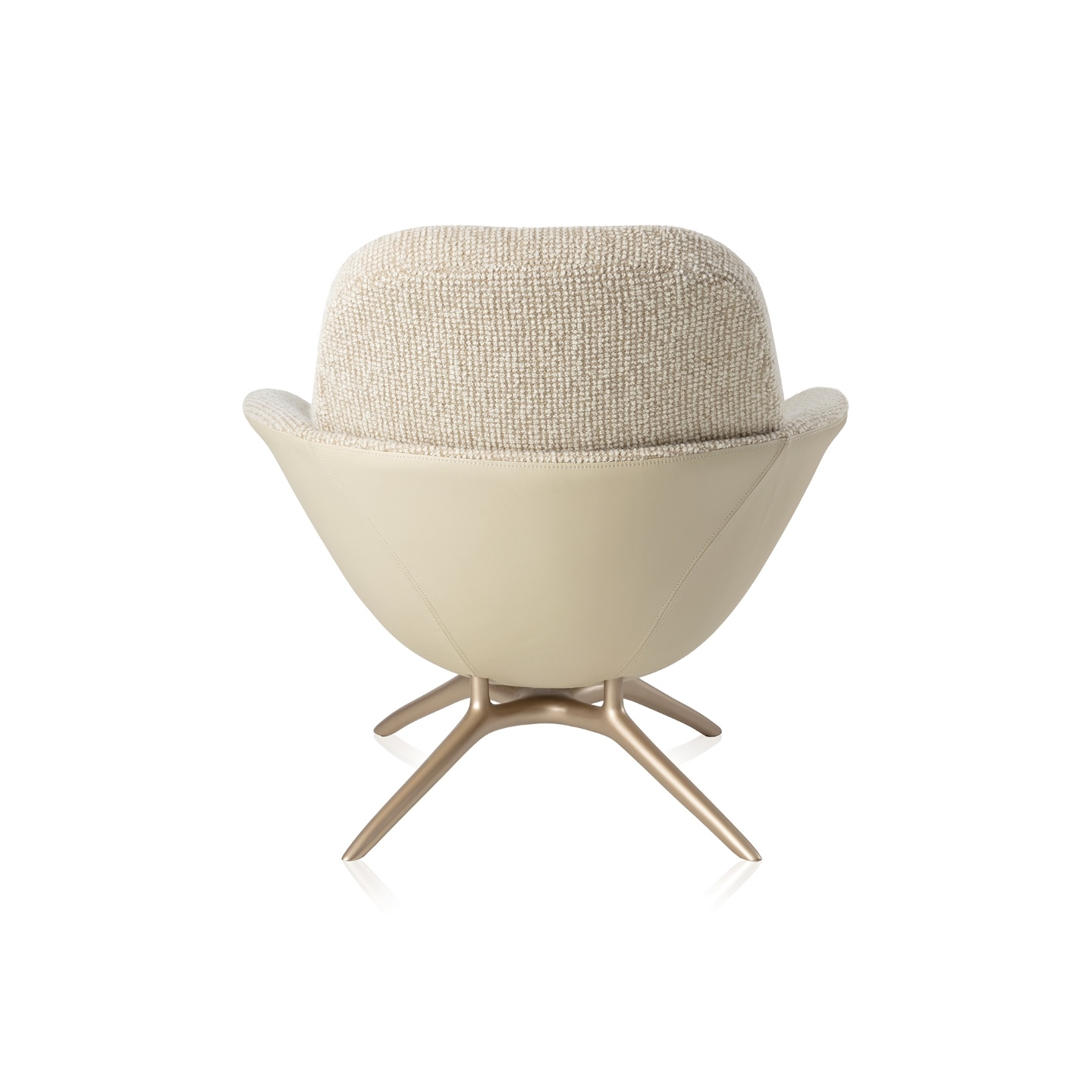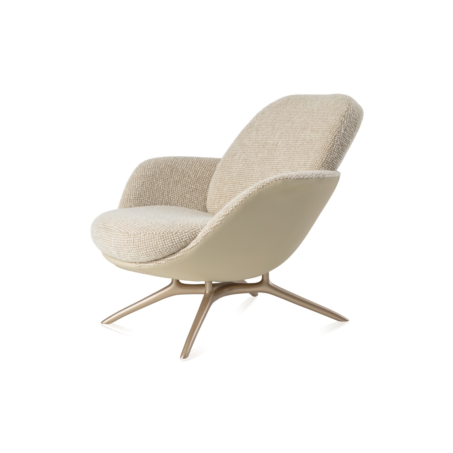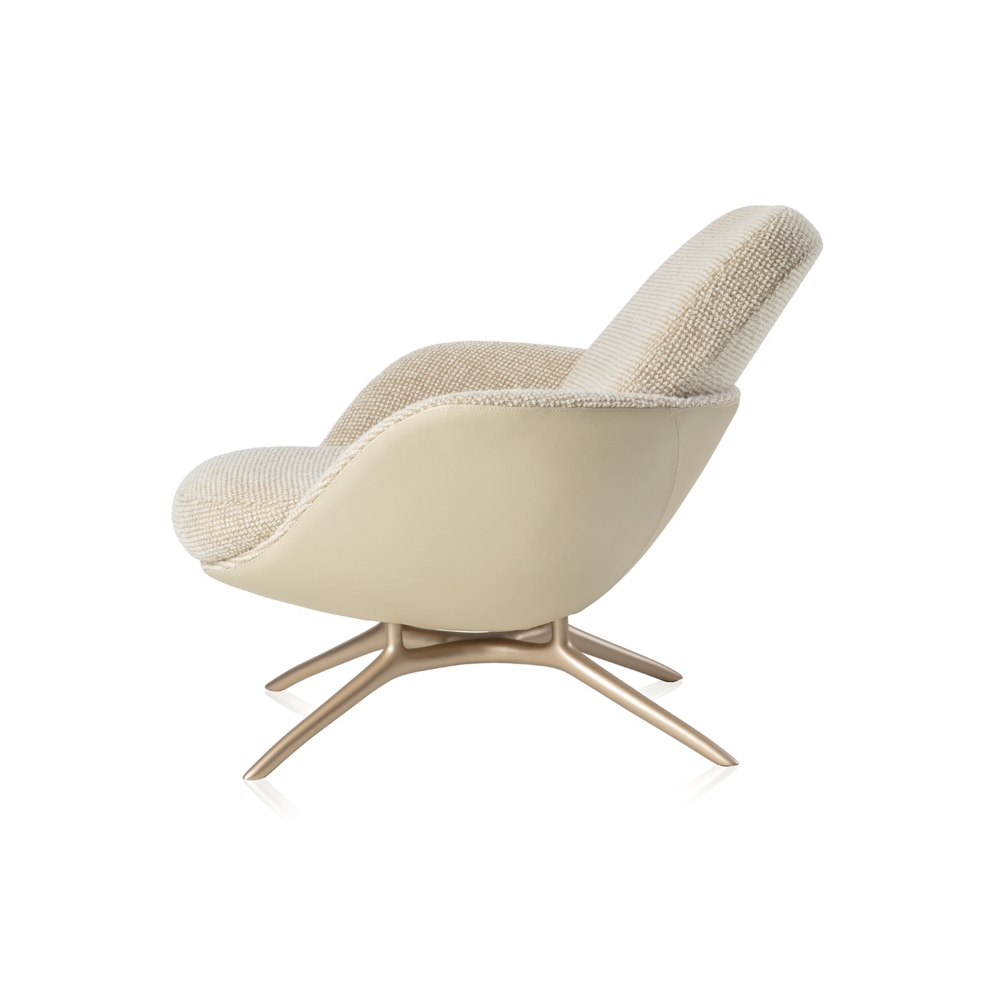 A inspiração futurista e retrô é evidenciada pelas linhas da poltrona. A silhueta sutil e precisa transmite sensação de conforto e intimidade. O sentar é assegurado pelo formato de concha que é sinônimo de aconchego. O acabamento pode ser combinado com diferentes tipos de tecidos e couros, em contraste com a base em cores solidas ou metalizadas. Uma peça elegante e marcante, a serviço do conforto.