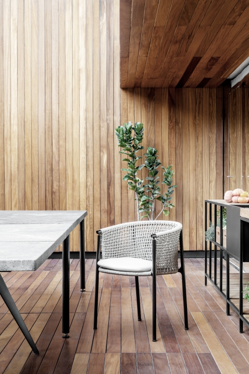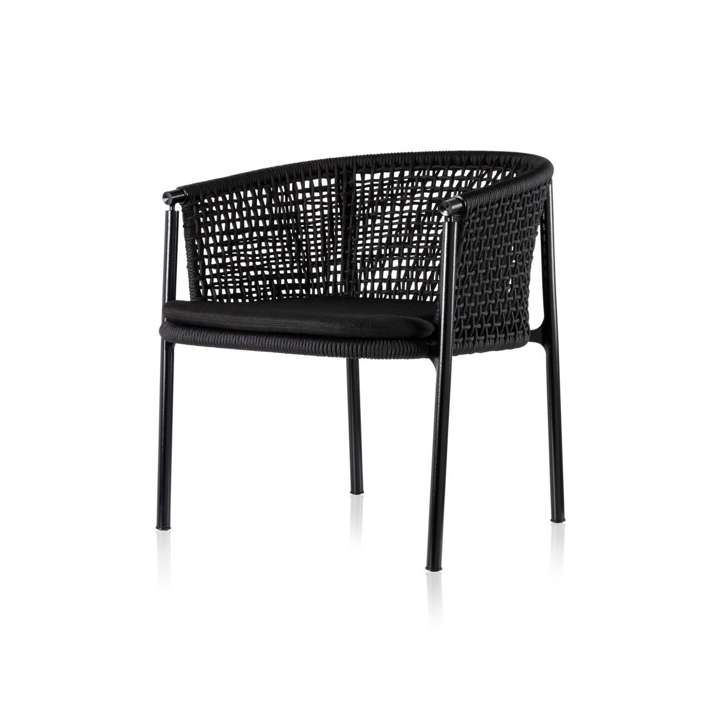 Estrutura: Metal, pintura eletroestática, aço carbono pintado Assento: Corda náutica, estofado revestido em tecido Encosto: Corda náutica Braços: Corda náutica
