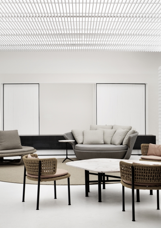 A poltrona Toni (em versões I e II) se destaca pelo refinado uso das cordas em tramado aberto. São esguias, leves e apresentam harmonia entre o trançado e suas estruturas metálicas. Possui identidade em uníssono com as demais peças da coleção JADERALMEIDA IN&OUT, e sugerem amplo uso em sacadas, varandas, decks e áreas de lazer.