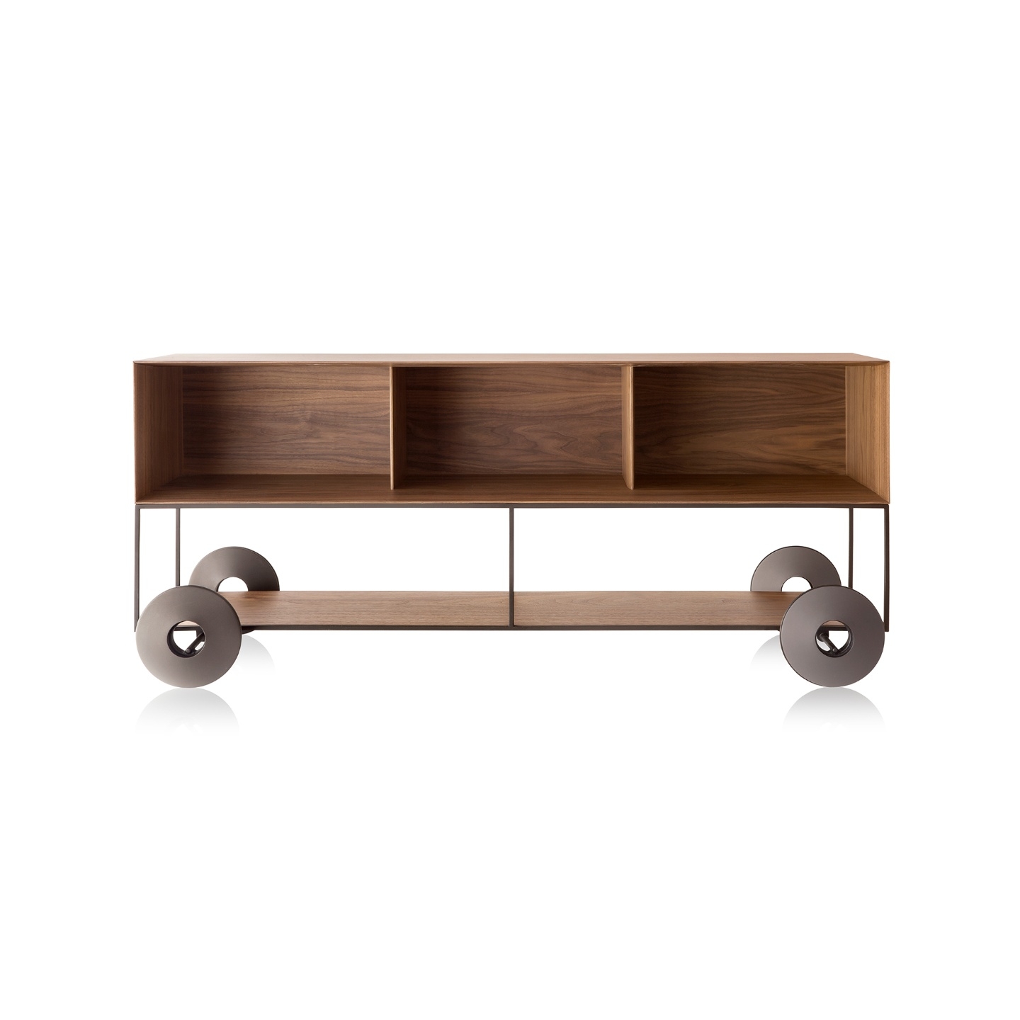 Estrutura: Laca, metalizado, aço carbono pintado Prateleiras: Laca, lâmina natural, lâmina tingida