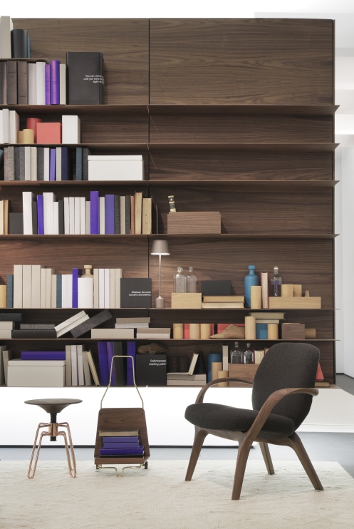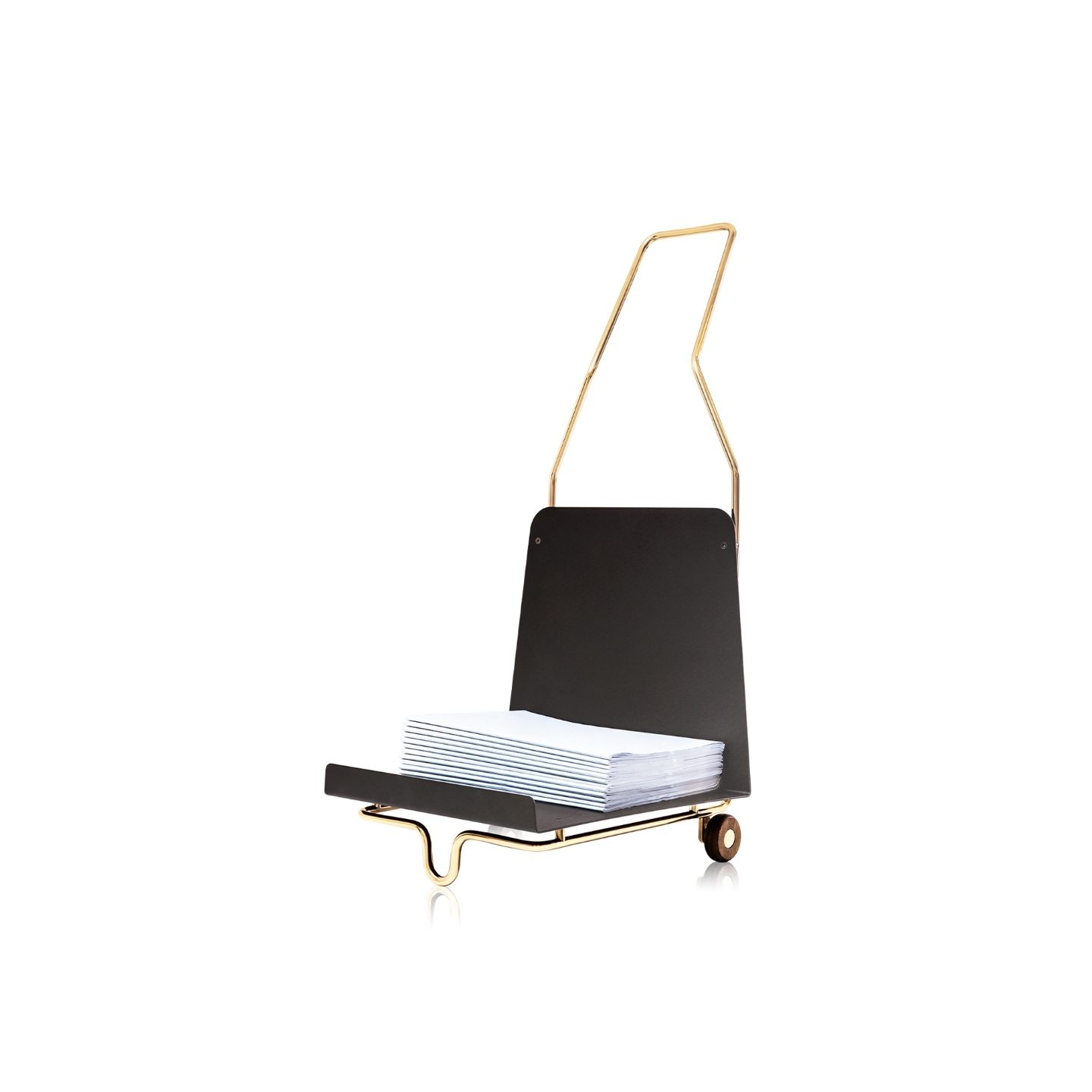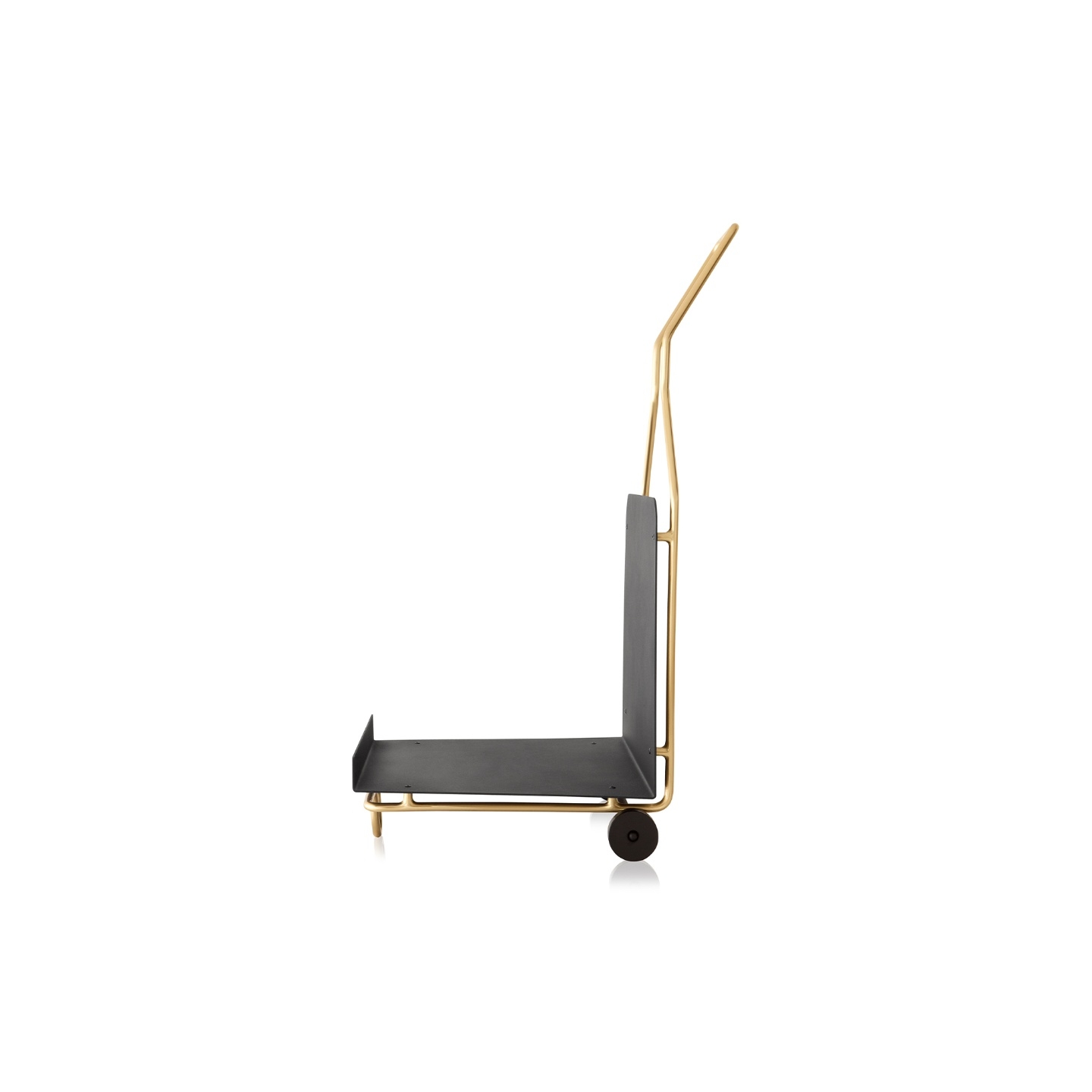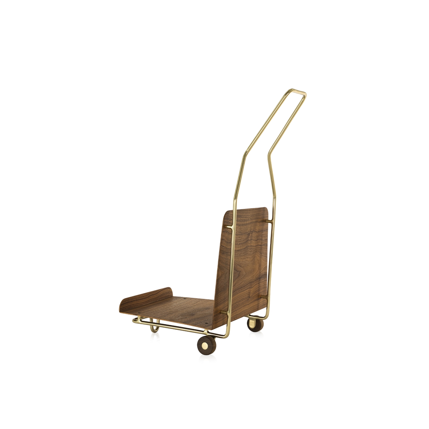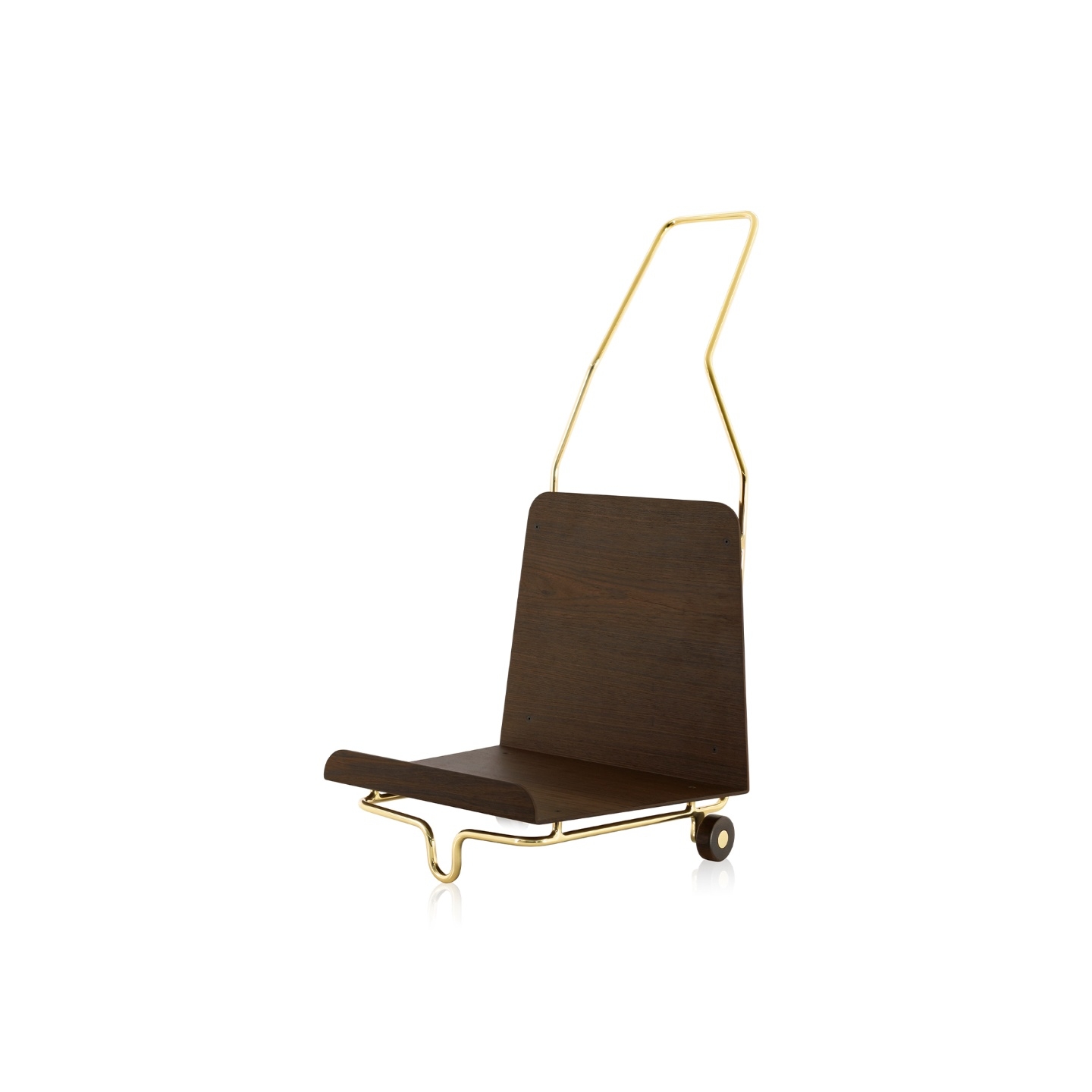 Seu desenho inusitado em estrutura de aço carbono, com rodas e alça que permitem o deslocamento de livros e revistas para o lugar onde o leitor desejar.