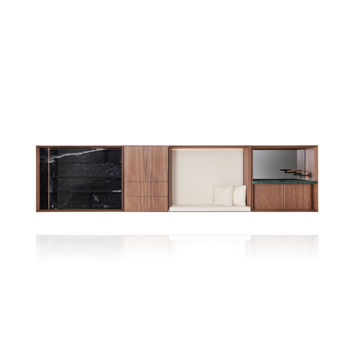 Um conjunto de módulos de serviço, apoio e armazenagem que quando combinados resultam em inúmeras soluções para diferentes necessidades. Uma resposta inteligente, prática e pronta para a realidade das residências atuais.