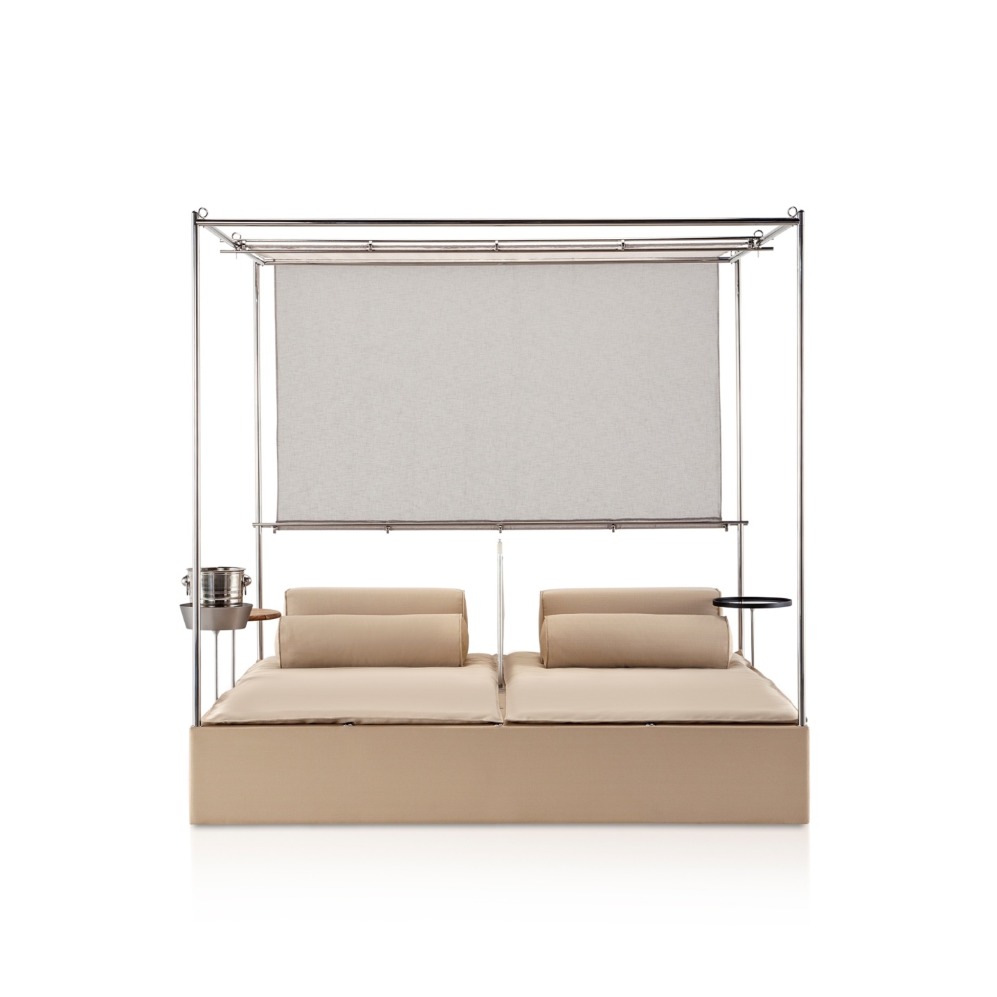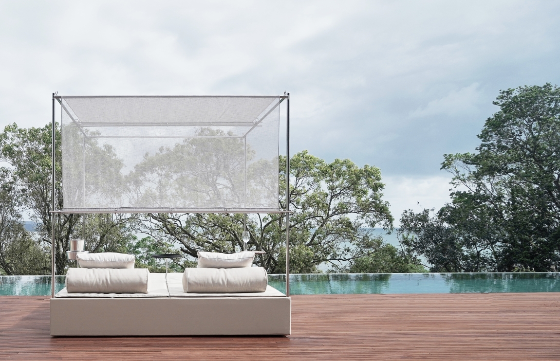 *Mesas de apoio: Base em aço inox, tampos em vidro ou madeira maciça. Porta gelo: Alumínio escovado. Divisórias: Aço inox e tecido outdoor. Cabana: Aço inox e tecido outdoor. Almofadas, rolos e esteiras: Espumas estofadas em tecido outdoor. Ombrelone: Estrutura em aço inox polido, braços em alumínio natural, sistemas em alumínio fundido, cobertura em tecido.