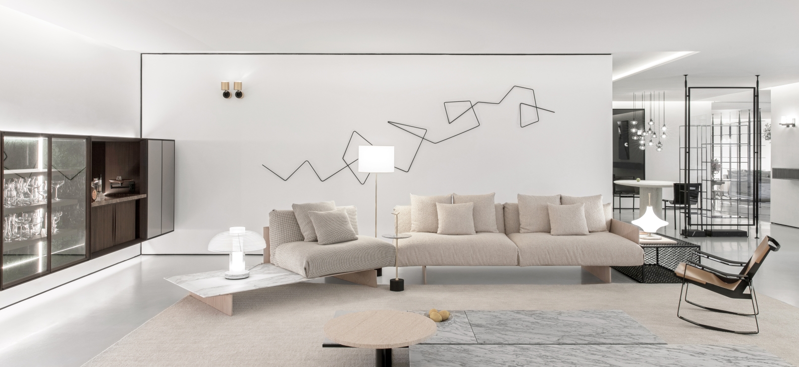 O contraste entre a simetria do desenho ortogonal da base elevada e a assimetria das grandes almofadas de pluma, atrai para uma agradável experiência no ambiente de estar. Uma expressão da assinatura do design contemporâneo.