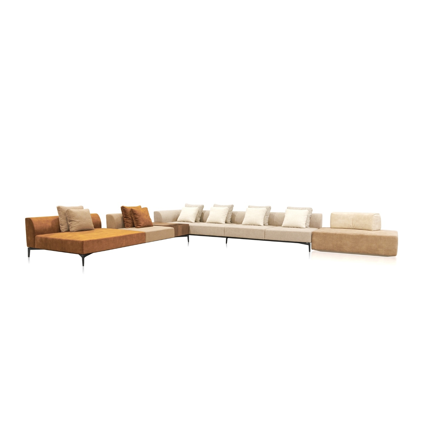 O tamanho dos braços varia conforme o comprimento do sofá. A base é em lâmina, com tonalidade próxima à dos pés. Verifique as variações disponíveis de acordo com os acabamentos dos pés.