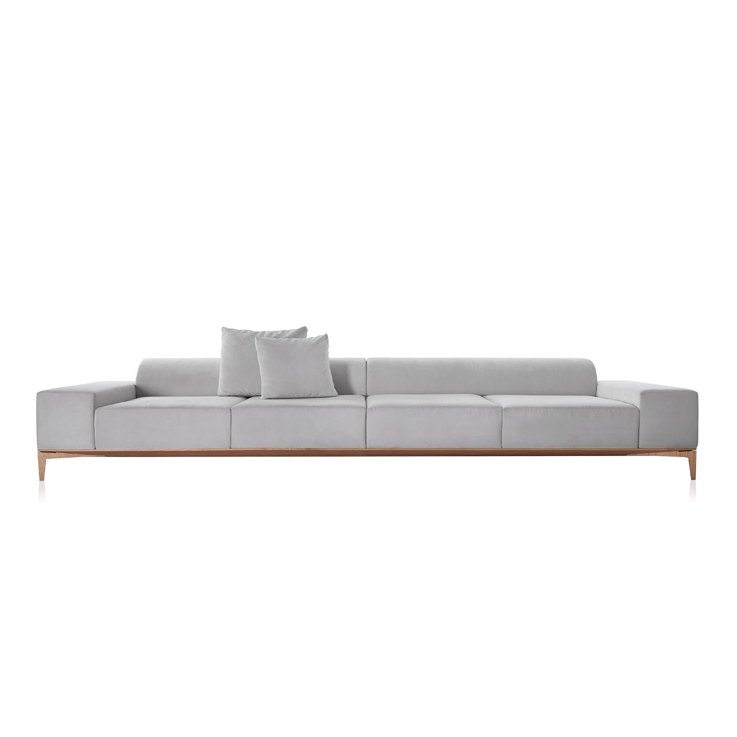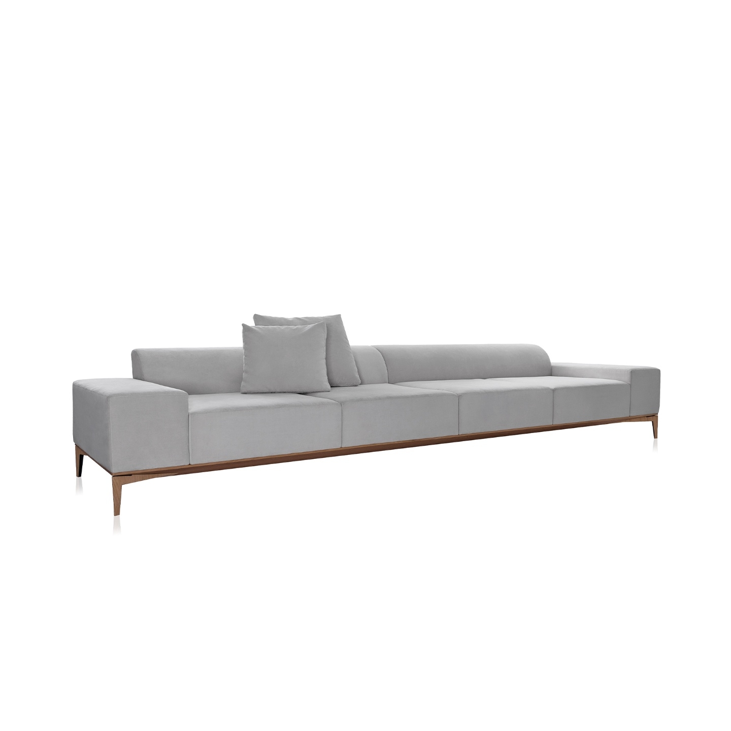 O tamanho dos braços varia conforme o comprimento do sofá. A base é em lâmina, com tonalidade próxima à dos pés. Verifique as variações disponíveis de acordo com os acabamentos dos pés.