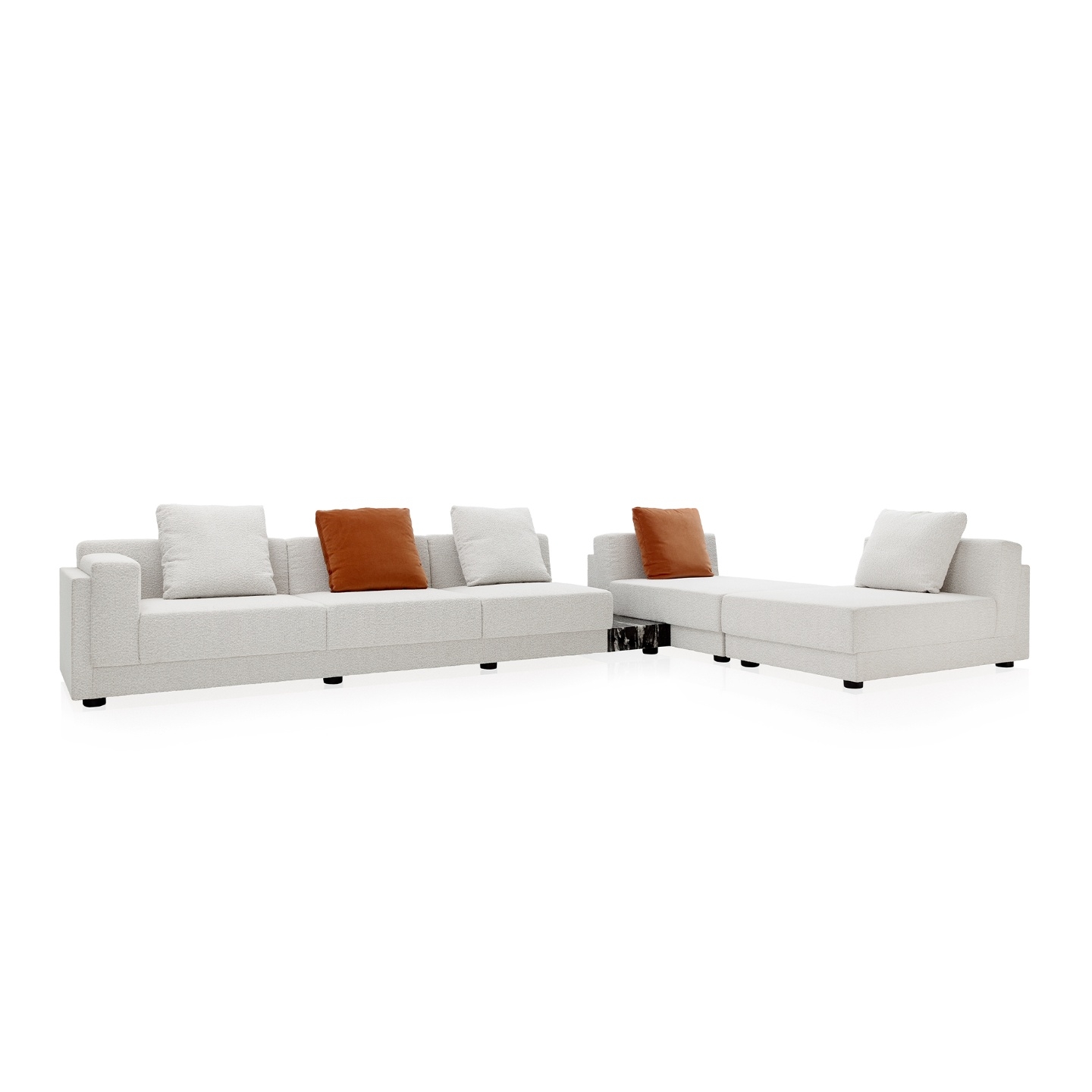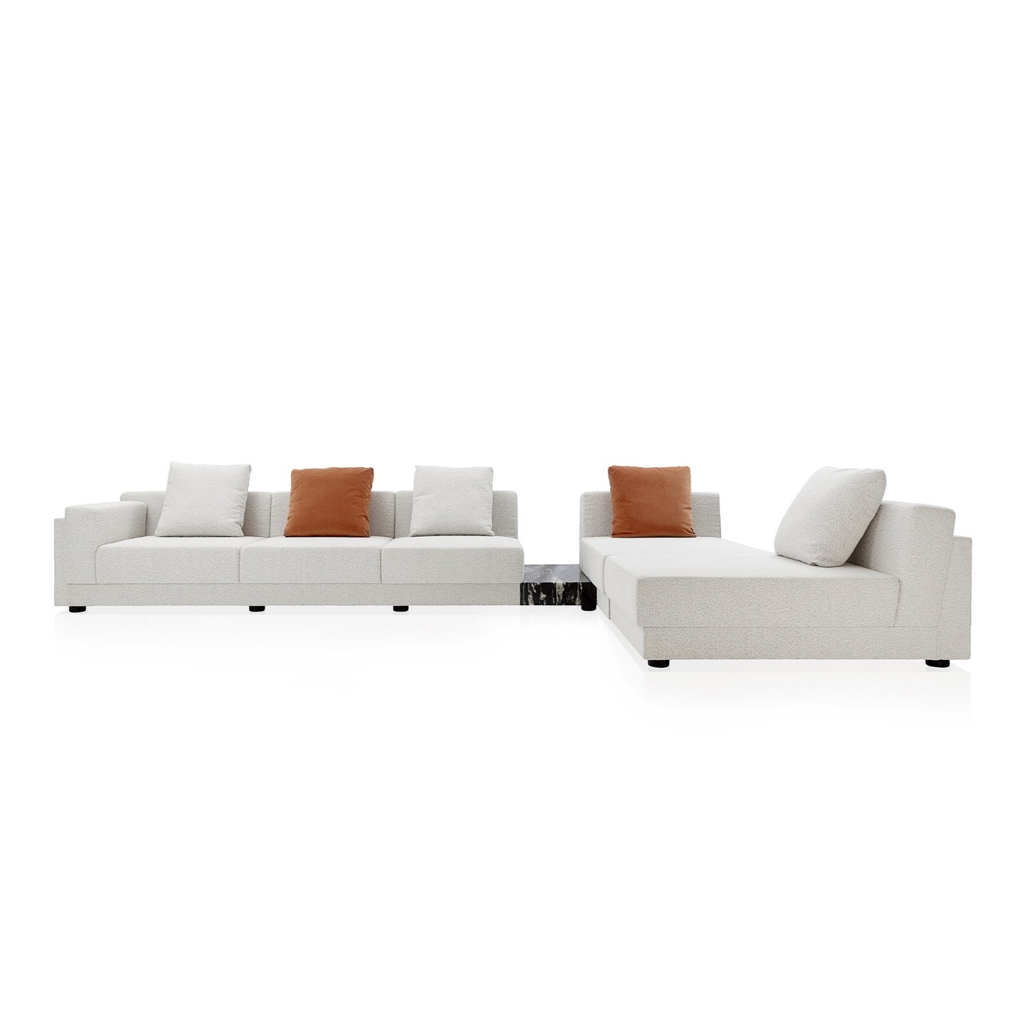 A Coleção SOTO é a síntese da criação de blocos modulares, cujas configurações permitem um jogo infinito de possibilidades. A combinação entre diferentes tecidos e materiais — como madeira e mármore nas transições e conexões — adiciona uma dimensão tátil e visual sofisticada, tornando cada composição única.