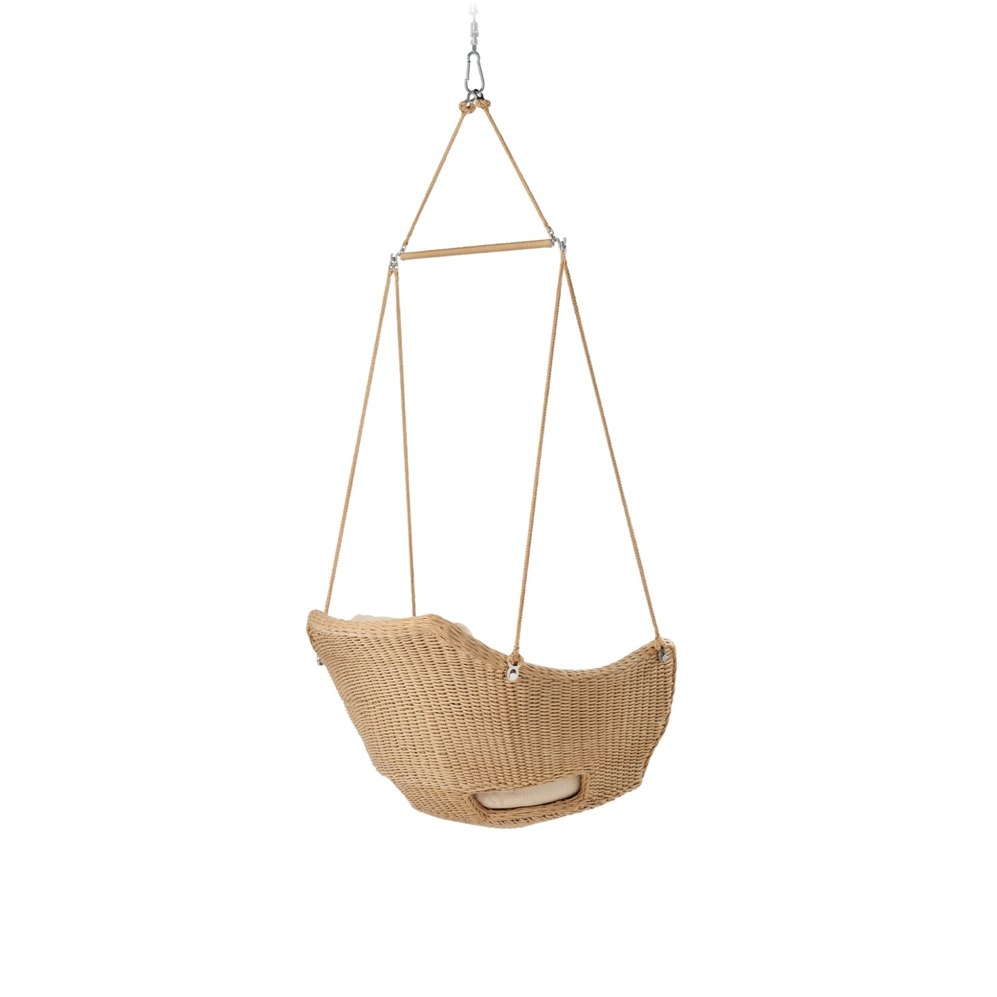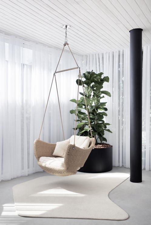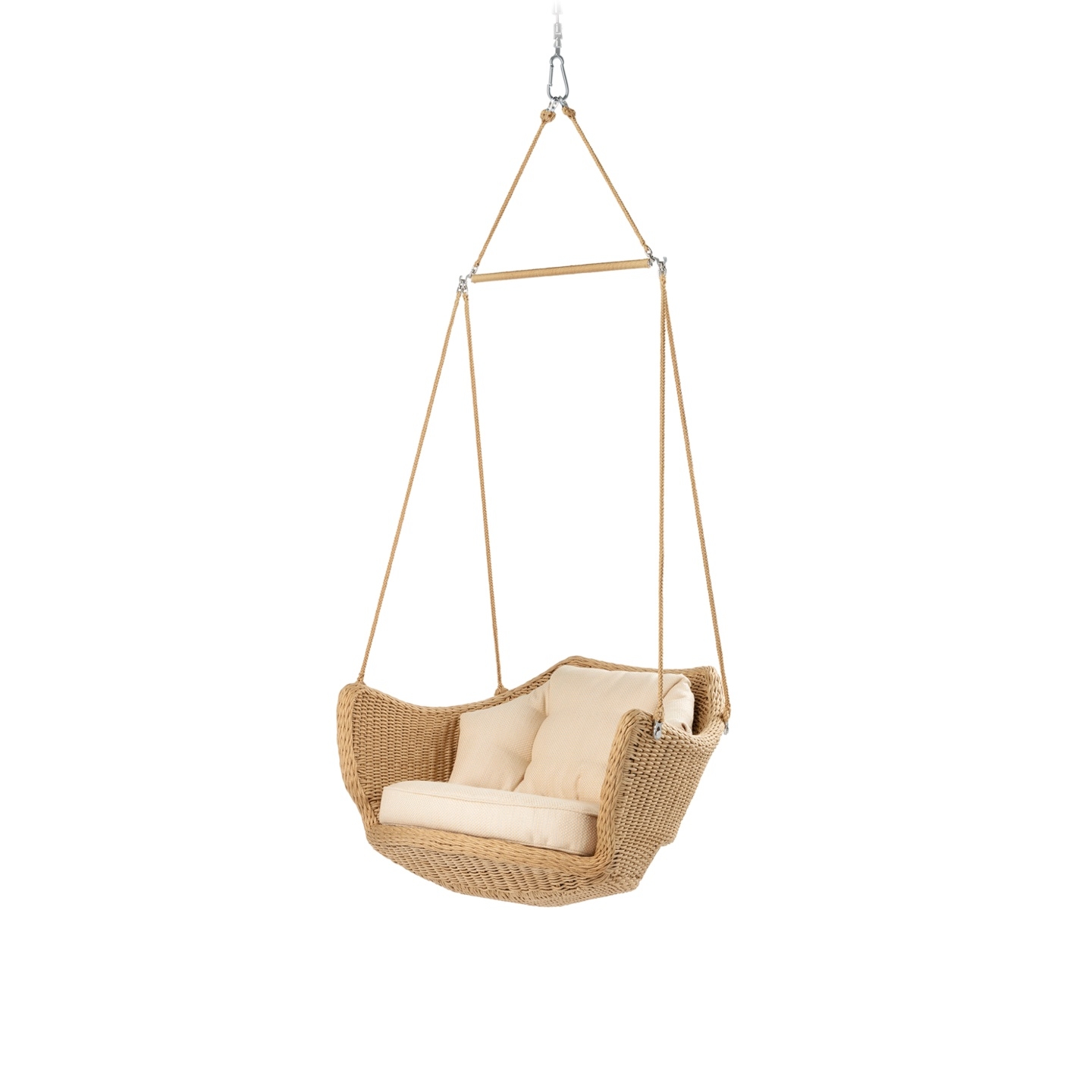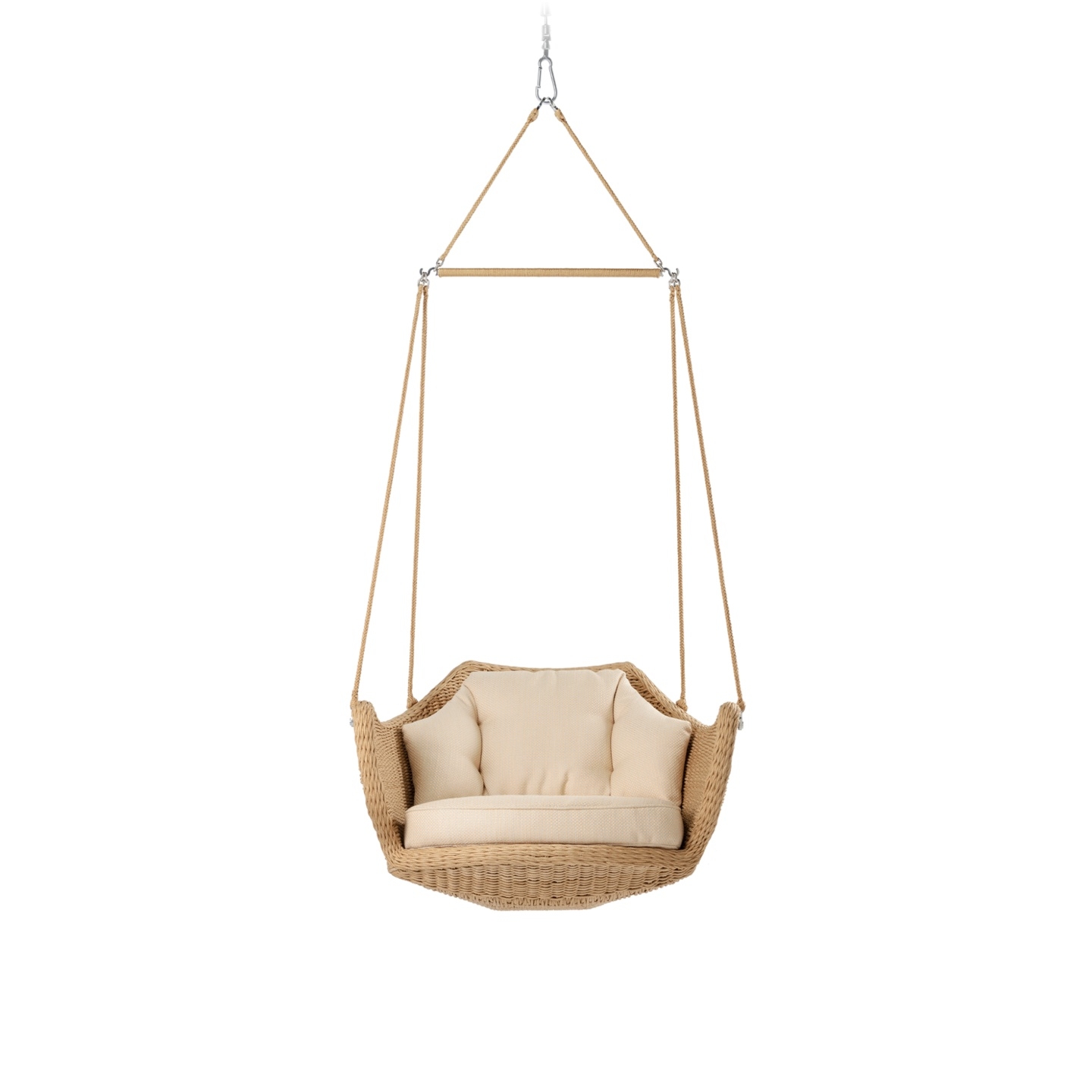 Preso por um único ponto no teto, o produto permite ao usuário o giro completo e um balançar suave. Com generosas almofadas no assento e no espaldar, é um elemento perfeito para o relaxamento em áreas de transição entre interno e externo.